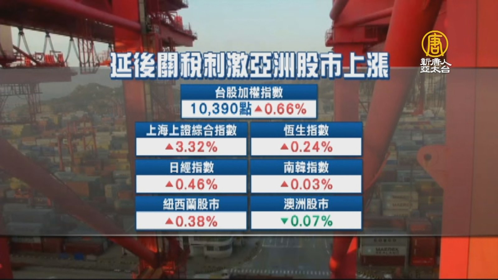 好,美國總統川普表示,美中貿易談判取得「實質性進展」,表示將延後對中國提高關稅的計畫,消息助長市場預期,美中雙方貿易戰可望結束,也激勵亞洲股市上漲。台股加權指數,今天一口氣站上10,390點,上漲0.66%, 上海上證綜合指數上漲3.32%;恆生指數漲0.24%,日經指數收漲0.46%;南韓指數小幅上漲0.03%;紐西蘭股市也是上揚0.38%;澳洲股市則是小跌0.07%。 //asset3.ntdtv.com.tw/public/uploads/assets/2019/02/25/2019-02-25-5c73da8cc5bd7.mp4 台股|川普|關稅|貿易戰2019-02-25 20:03:58