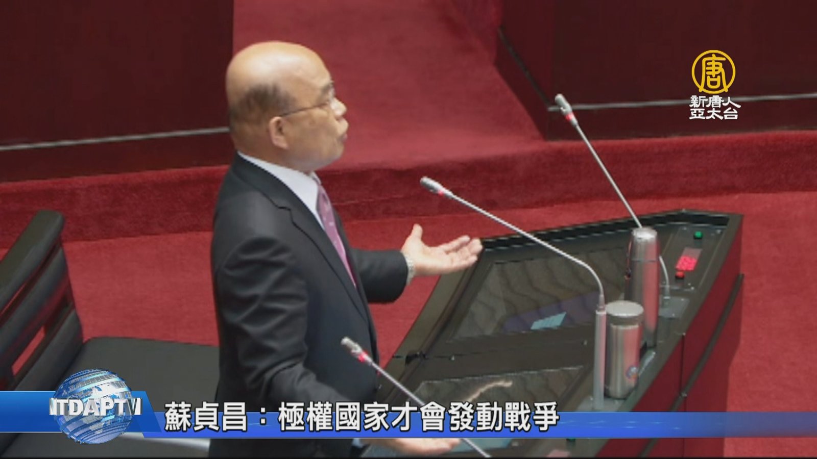 中共不放棄武力犯台,行政院長蘇貞昌的戰爭說,也持續引起討論。蘇貞昌今天(26日)在立法院備詢時,又被問到相同議題,蘇貞昌說他期盼和平,更引用蔣中正的「一寸河山一寸血」,強調面對敵人侵犯絕不投降。再批簽和平協議是投降主義,還說如果蔣中正在世,一定也會反對。 //asset1.ntdtv.com.tw/public/uploads/assets/2019/02/26/2019-02-26-5c752f0867932.mp4 蘇貞昌|和平協議|國民黨立委2019-02-26 20:58:48