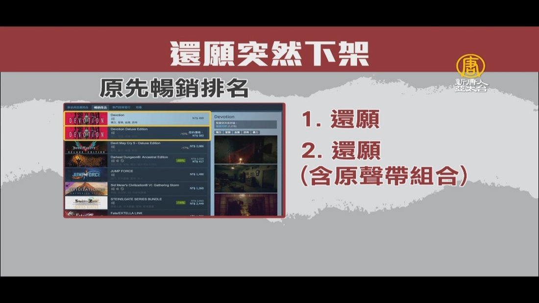 國產恐怖遊戲「還願」,因藏彩蛋讓13億中國人不敢玩而爆紅,還登上英國廣播公司BBC等外媒版面,但今天凌晨4點突然無預警從遊戲平台下架。PTT上一片哀嚎,有不少人質疑遭中共施壓。官方宣稱,是部分電腦會無法開啟跟閃退,重新進行軟體品質檢測,才「暫時下架」。但在這個節骨眼,格外引人聯想。 //asset2.ntdtv.com.tw/public/uploads/assets/2019/02/26/2019-02-26-5c75437224859.mp4 還願|遊戲|中共施壓2019-02-26 21:42:04