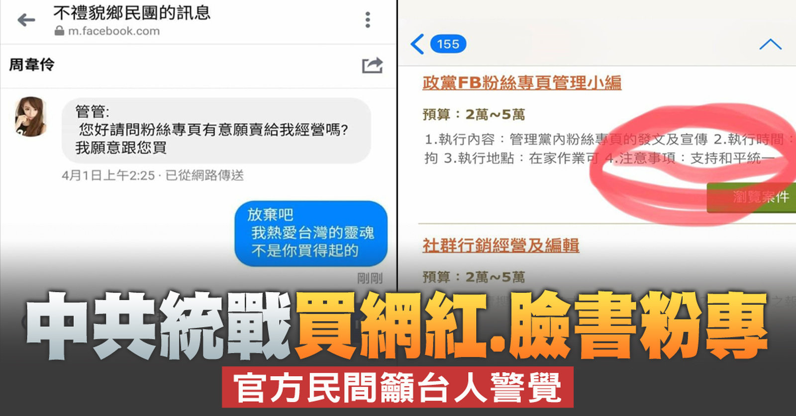 中共統戰買網紅.臉書粉專 官方民間籲台人警覺