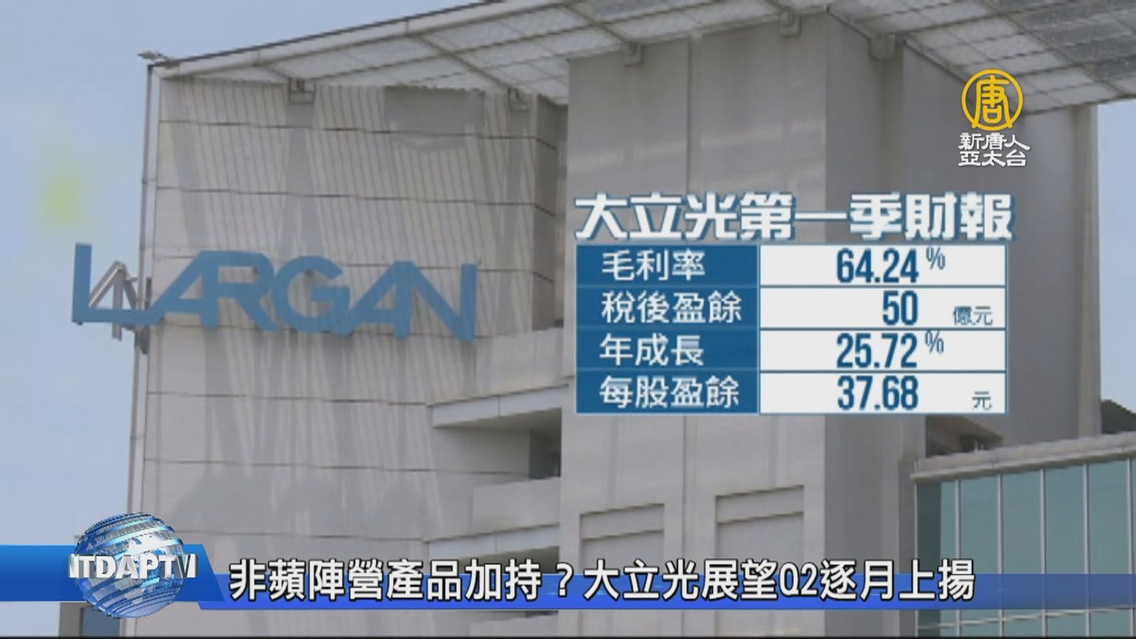 大立光主力客戶蘋果去年iPhone新機表現不如預期,但大立光第一季財報表現,年增率卻呈現雙位數的正成長,超乎法人預期。市場解讀,主要動能來自非蘋陣營的拉貨,大立光周四舉辦法說會,展望第二季,執行長林恩平表示,將逐月上揚。 //asset1.ntdtv.com.tw/public/uploads/assets/2019/04/11/2019-04-11-5caf38ba047d5.mp4 大立光|多鏡頭|趨勢|法說2019-04-11 20:50:44