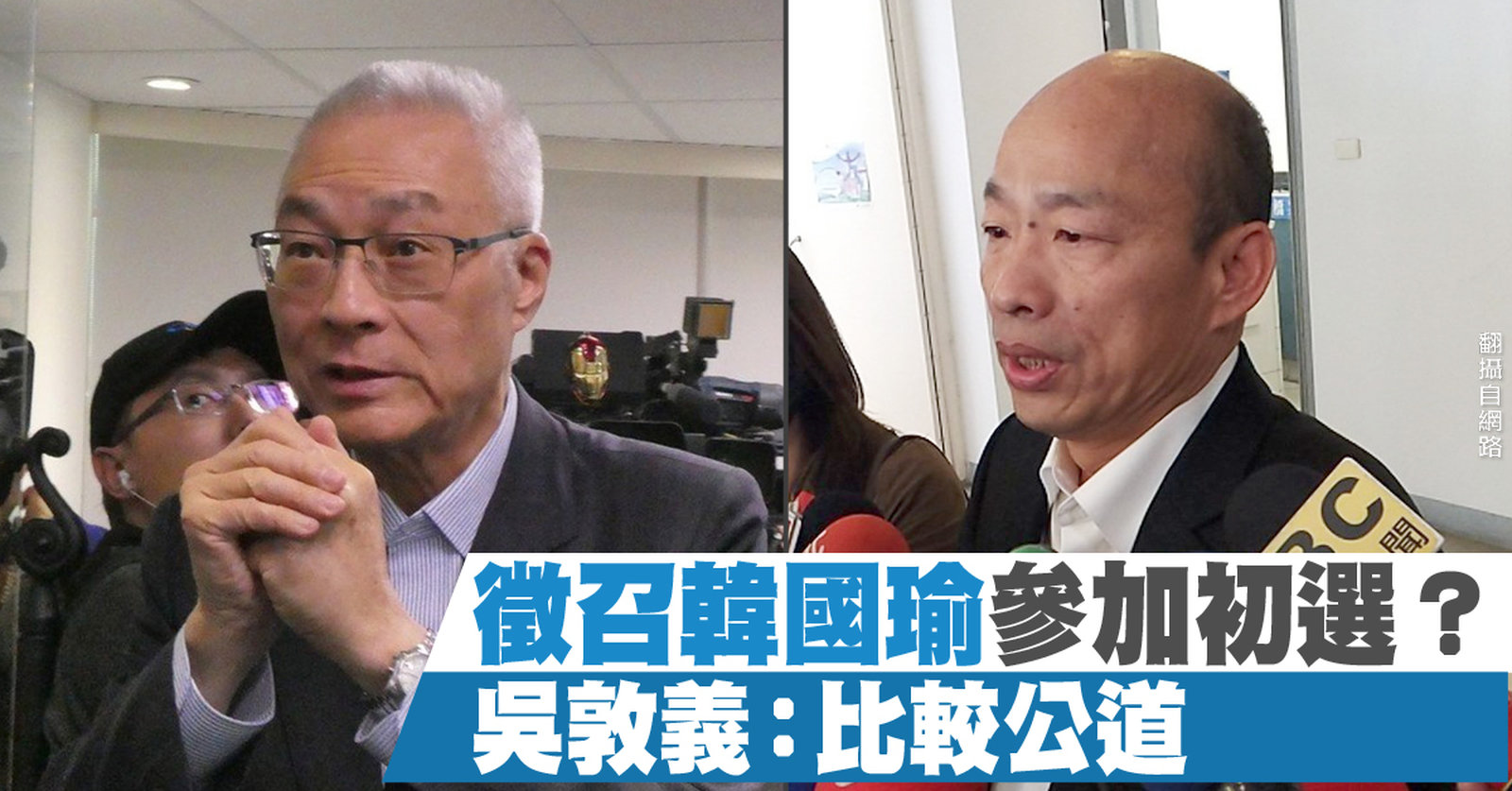 鴻海董事長郭台銘宣布參加國民黨內總統初選,並強調不接受徵召,為國民黨總統提名人選,投下變數,國民黨主席吳敦義今天接受廣播專訪表示,會徵召韓國瑜參加初選,因為這樣比較公道,會盡快與各候選人會面,瞭解他們對初選機制的想法。 //asset1.ntdtv.com.tw/public/uploads/assets/2019/04/19/2019-04-19-5cb9bc5b86ad1.mp4 吳敦義|國民黨|黨內初選|韓國瑜|2020|郭台銘|總統大選2019-04-19 20:12:47