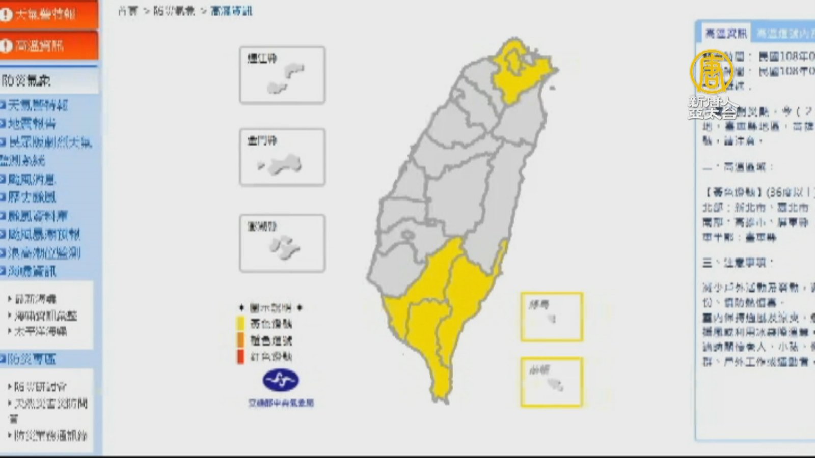 今天天氣還是相當炎熱,白天氣溫比昨天還要高,全台有5縣市達到黃色燈號警示標準,用電量也刷新歷年以來,4月最高紀錄。至於今天的最高溫,則是出現在高雄的月眉,有35.2度,不過,比昨天台北的35.4度,略低了一點。氣象局分析,由於今天白天雲量較多,加上海風進來時間較早,因此高溫影響沒有昨天明顯。明天,高溫可能將達36度以上,而26、27日,兩天,受鋒面影響,各地有局部陣雨或雷雨的機率,氣溫略降,一直到28日到30日鋒面遠離,天氣逐漸好轉,氣溫又會 再度回升。 //asset3.ntdtv.com.tw/public/uploads/assets/2019/04/24/2019-04-24-5cc0530d1e900.mp4 天氣預報|高溫|黃色燈號2019-04-24 20:05:22