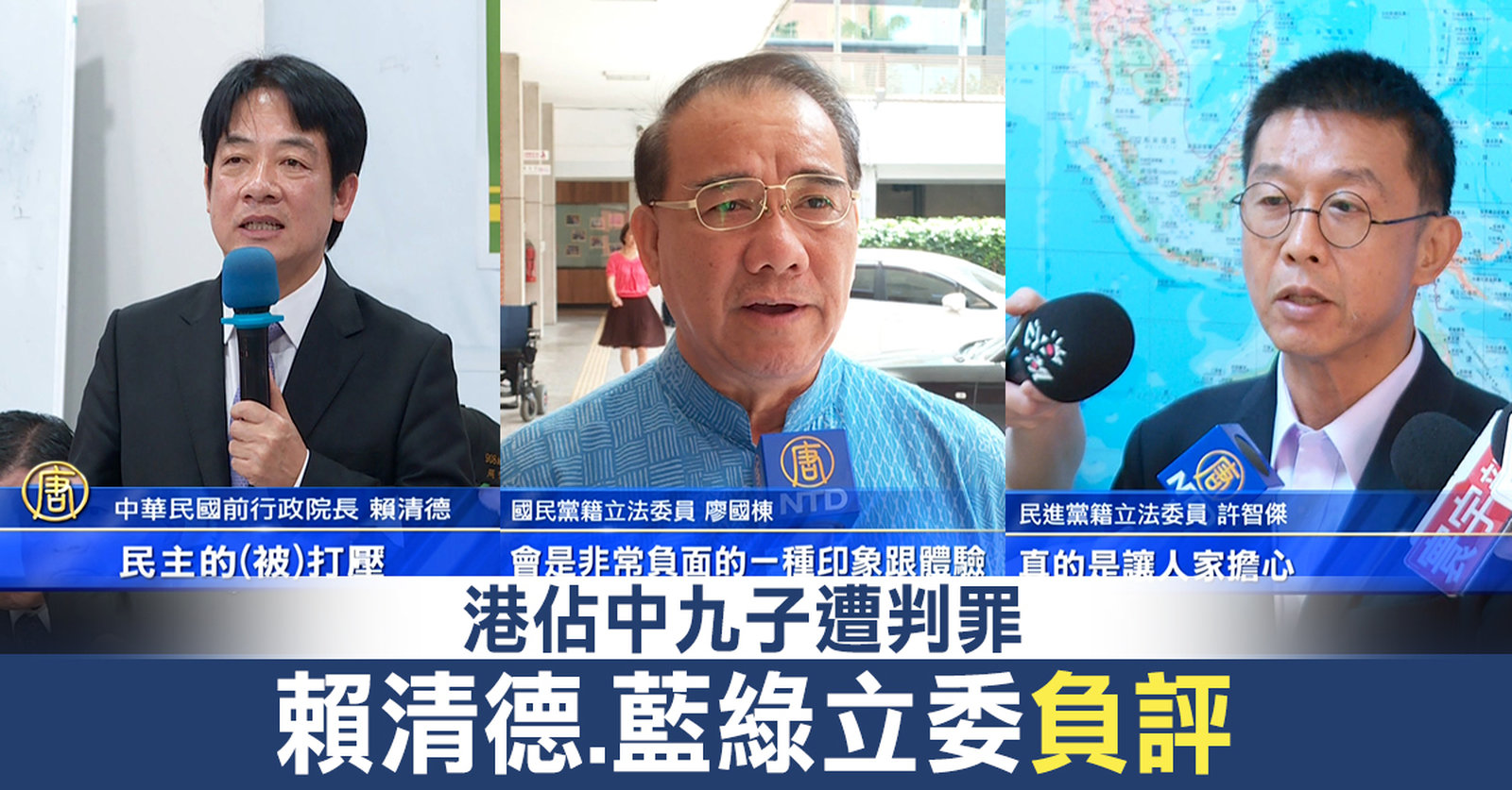 香港2014年雨傘運動、佔中運動,訴求落實民主真普選,當時獲得台灣政界朝野支持。香港法院昨天(24日)判決,9名主要參與者,「佔中九子」有罪,四人被重判入獄8到16個月。台灣兩大黨國會議員認為,這是非常負面的訊息。賴清德今天主動談到這項判決的啟示。 //asset1.ntdtv.com.tw/public/uploads/assets/2019/04/25/2019-04-25-5cc1a9713bf58.mp4 香港雨傘運動|佔中九子|判決入獄2019-04-25 20:32:28