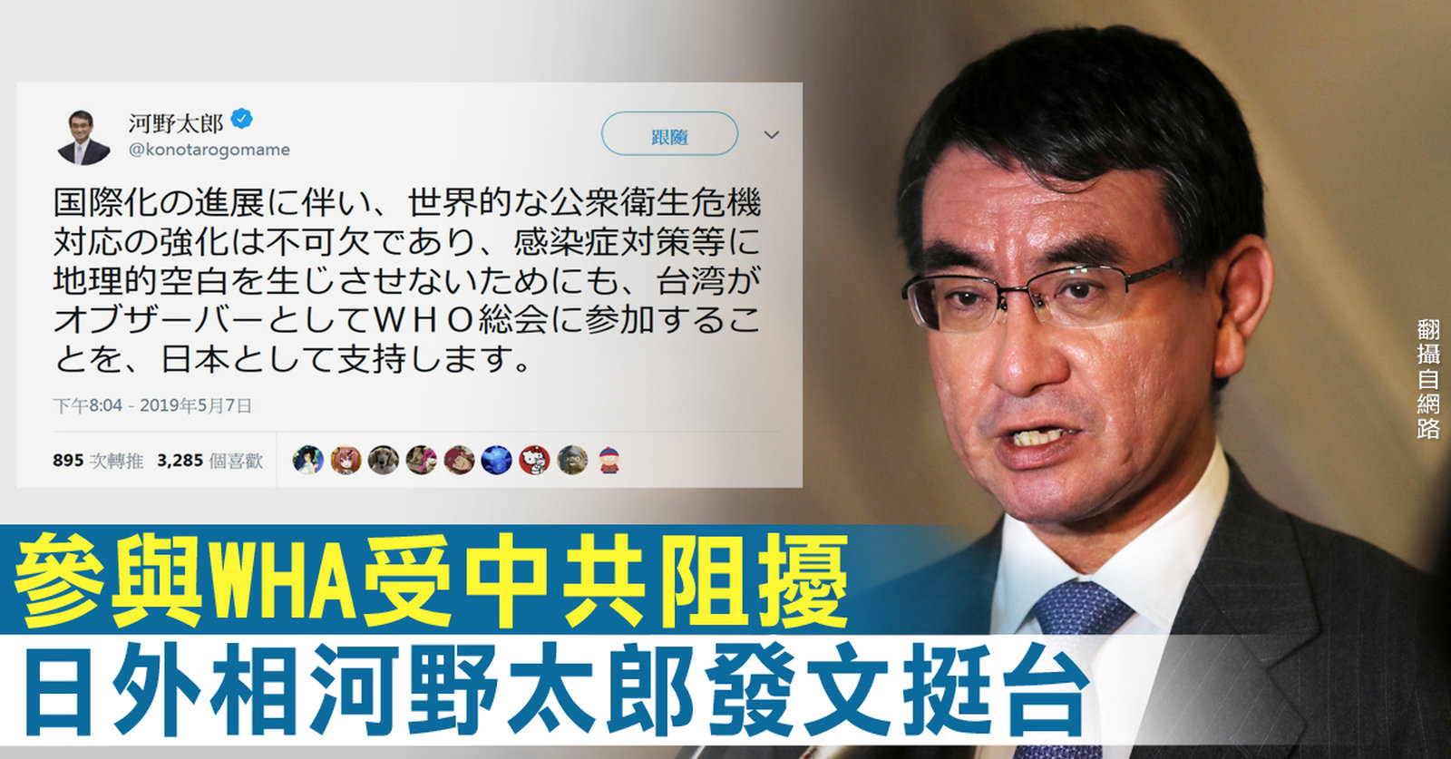 參與WHA受中共阻擾 日外相河野太郎發文挺台