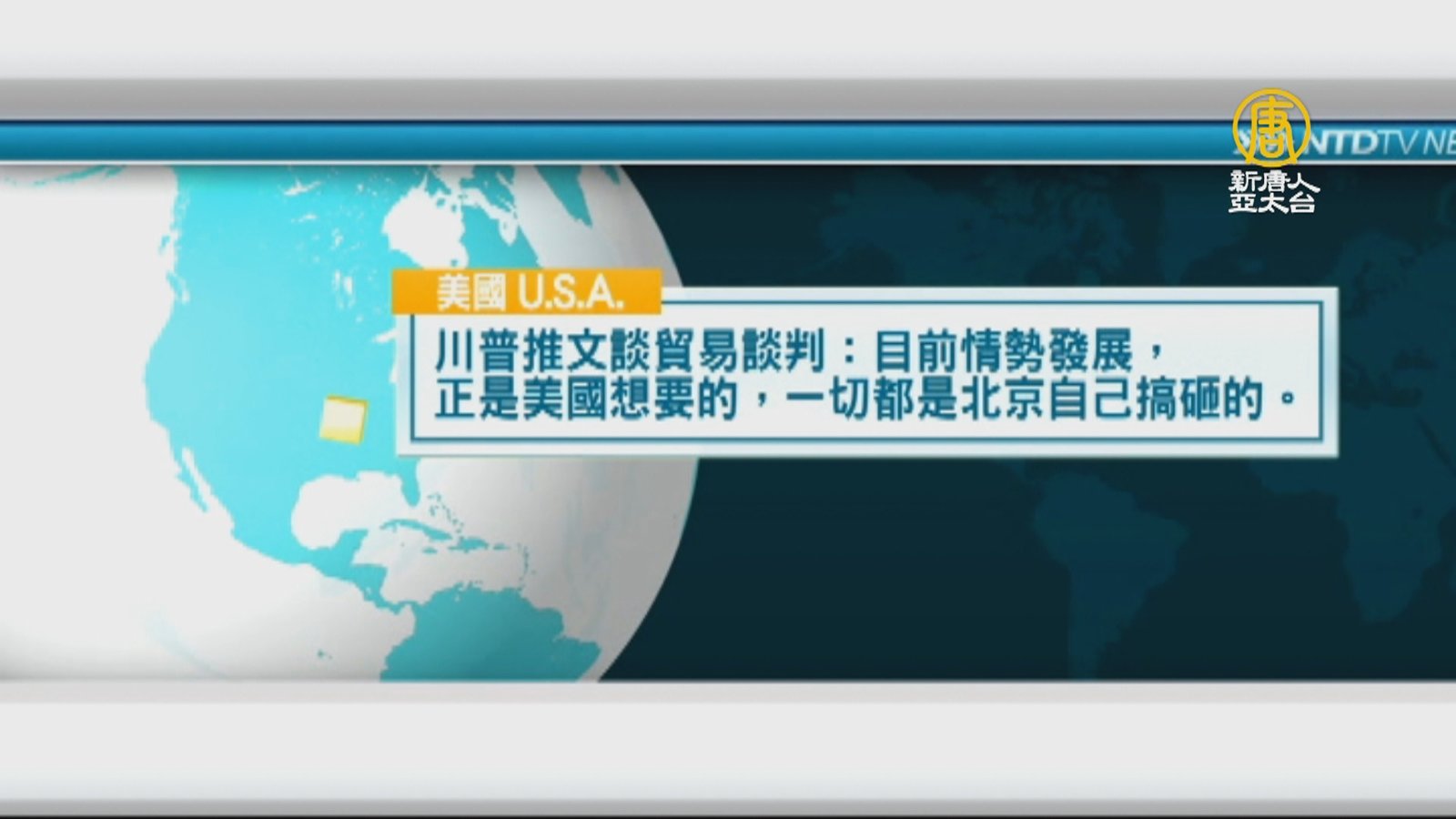 新聞一開始,先來關心,中國副總理劉鶴赴美,進行美中第11次貿易談判,最後,以無結論收場;今天,白宮將宣布對,3250億美元的中國商品關稅細節;而川普警告中共,不要想再拖延到2020美國大選後,否則談判條件會更糟。川普強調,中共違背承諾在先,買家可以改在美國生產商品,或從其他零關稅國家進口。 //asset3.ntdtv.com.tw/public/uploads/assets/2019/05/13/2019-05-13-5cd95e42b628a.mp4 美中貿易戰|川普|柯德洛|關稅|2020美國大選2019-05-22 23:26:01