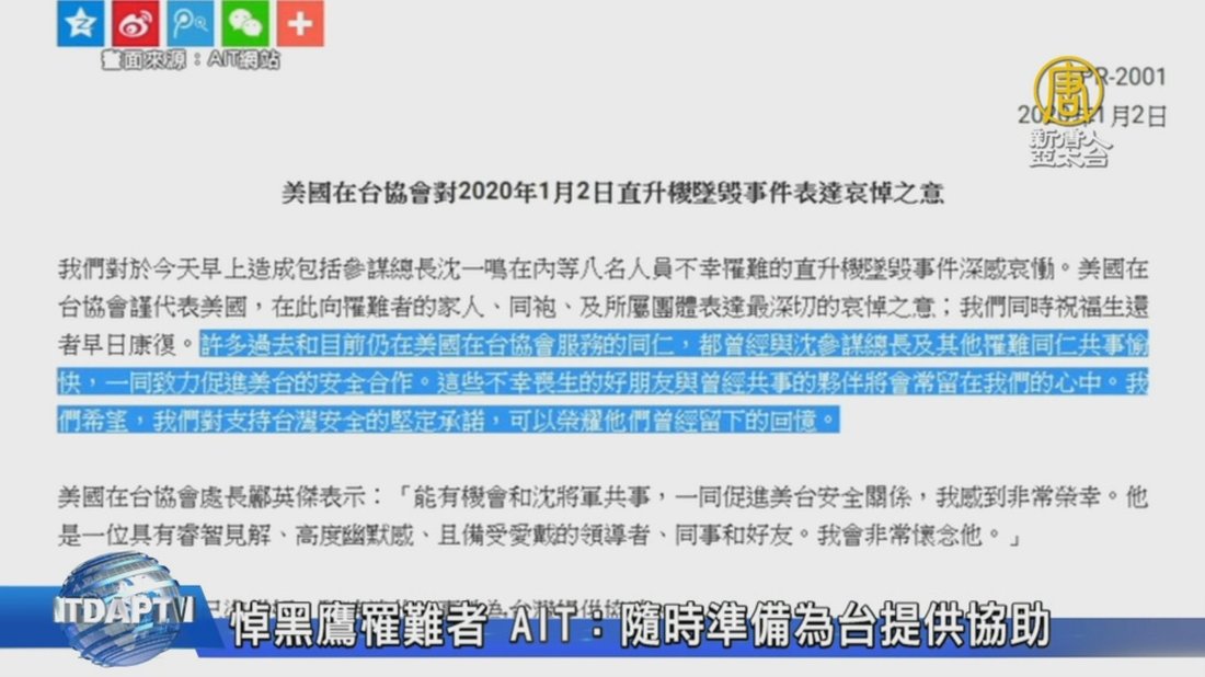 好,參謀總長沈一鳴等八名軍方人員不幸罹難,美國在台協會也發表聲明,表示深切哀悼,也祝福生還者早日康復。聲明並寫道,「許多過去和目前仍在美國在台協會服務的同仁,都曾經與沈參謀總長及其他罹難同仁共事愉快,一同致力促進美台的安全合作。...我們希望,我們對支持台灣安全的堅定承諾,可以榮耀他們曾經留下的回憶。」美國在台協會處長酈英傑表示:「能有機會和沈將軍共事,一同促進美台安全關係,我感到非常榮幸。...我會非常懷念他。」美國在台協會並表示,已經準備好,隨時就這一事件為台灣提供協助。 //asset2.ntdtv.com.tw/public/uploads/assets/2020/01/02/2020-01-02-5e0ddf033d46e.mp4 黑鷹迫降|黑鷹直昇機|沈一鳴|參謀總長|AIT|美國2020-01-02 20:13:28
