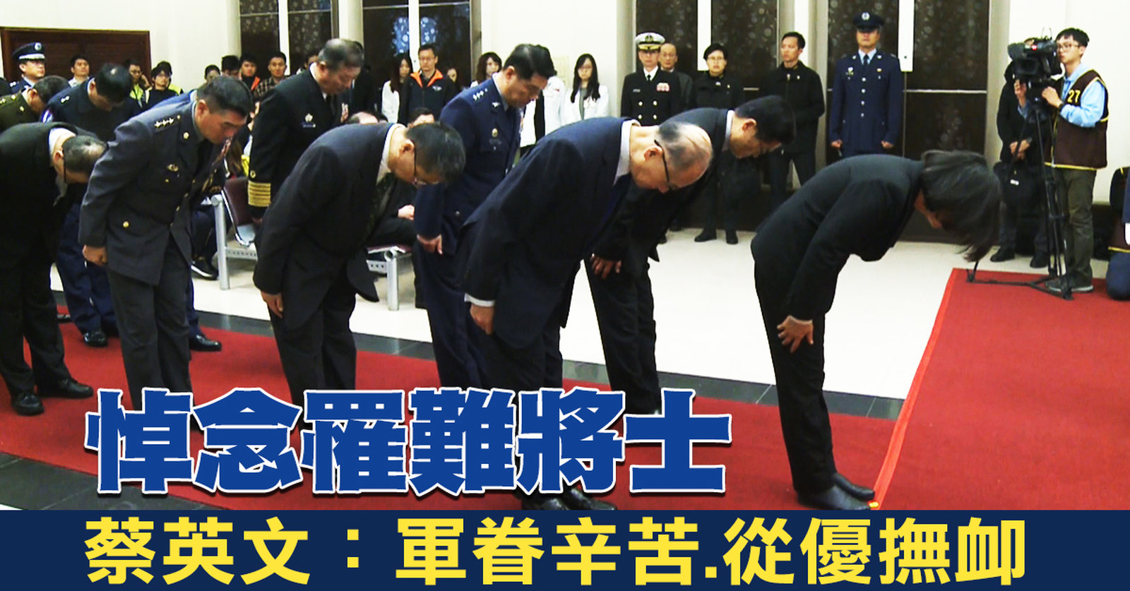 歡迎回來,國軍在三總懷德廳設置靈堂,供外界弔唁殉職將士,今天(3日)一早,總統蔡英文先到病房探視傷者,再前往靈堂上香,前總統馬英九、台北市長柯文哲、高雄市長韓國瑜等人,不分黨派,為不幸罹難的國軍將領,送上最後一程。而沈一鳴昔日的老長官,前空軍副總司令葛光越也號召同袍,到場致意。 //asset3.ntdtv.com.tw/public/uploads/assets/2020/01/04/2020-01-04-5e0f4ae753e26.mp4 黑鷹迫降|黑鷹直升機|沈一鳴|葛光越2020-01-03 21:57:04