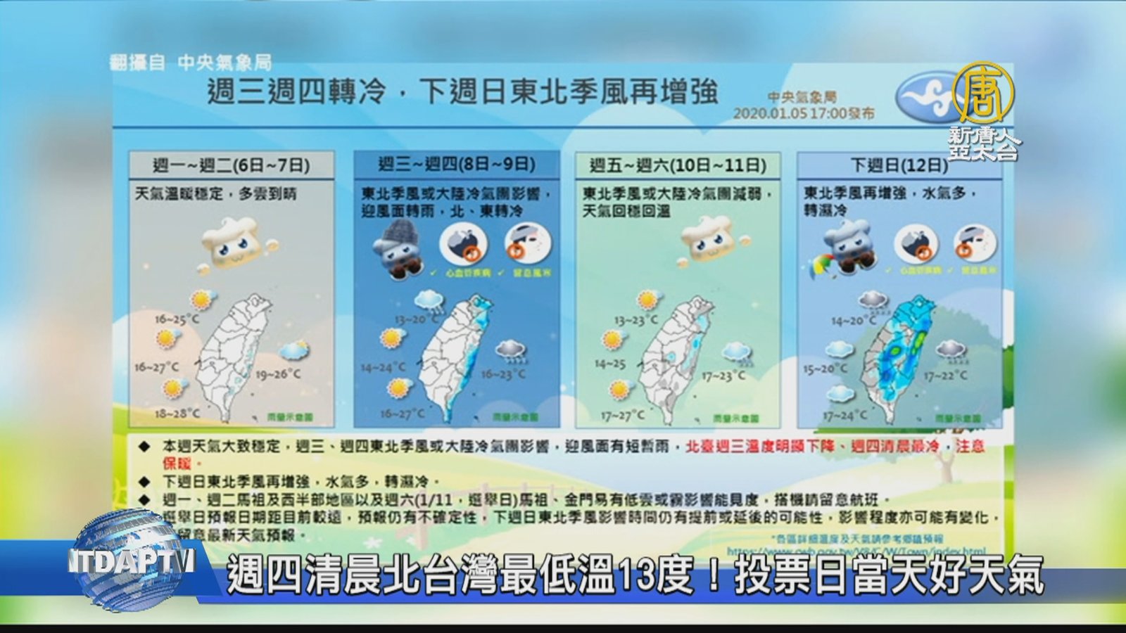 接著帶您來看到1月8日的天氣預報。 //asset3.ntdtv.com.tw/public/uploads/assets/2020/01/07/2020-01-07-5e14816945394.mp4 2020-01-07 21:01:04