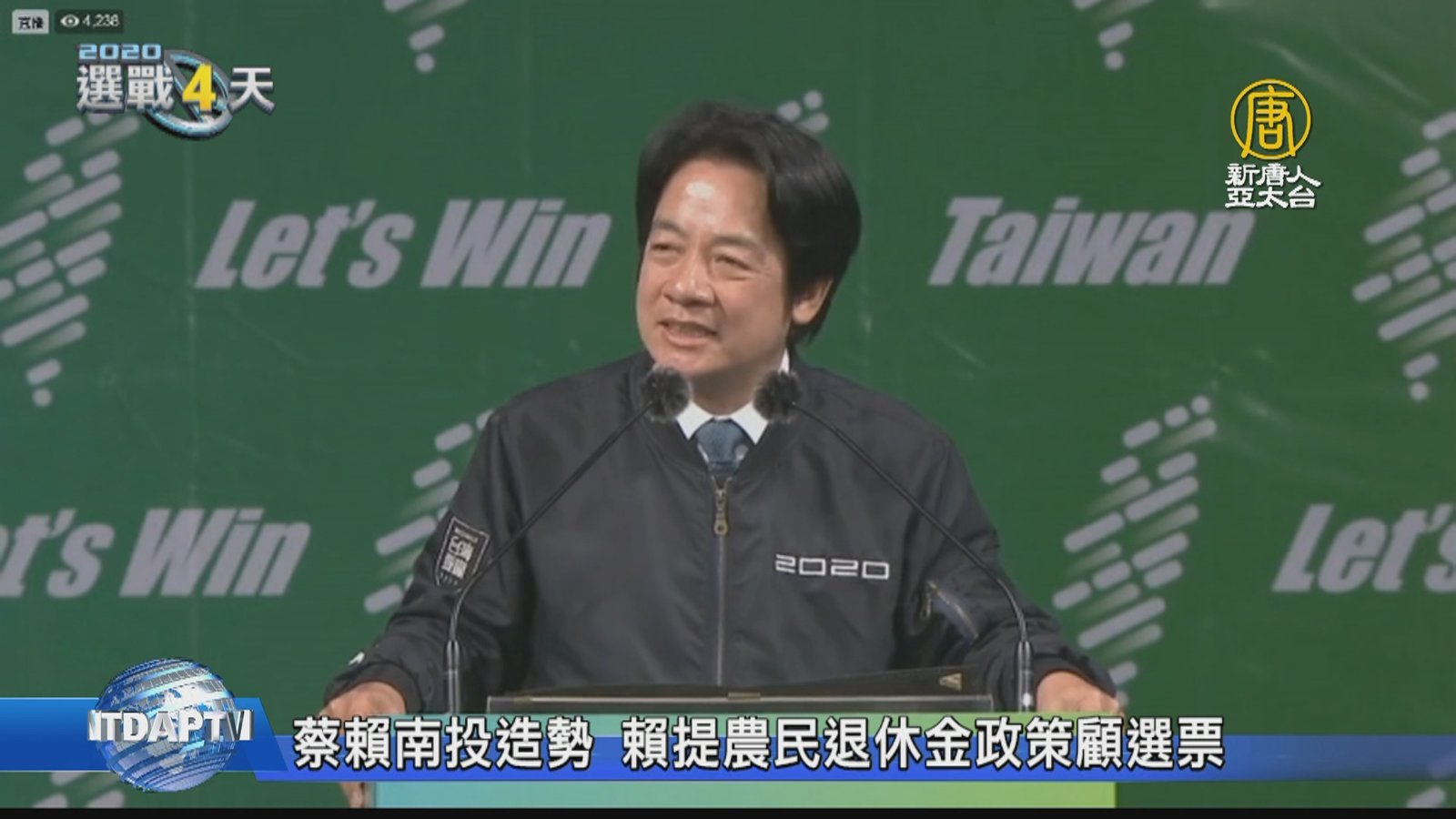 選戰倒數最後3天,民進黨副總統候選人賴清德與總統蔡英文、副總統陳建仁、黨主席卓榮泰,兵分四路在全國進行車隊掃街,7日晚間,賴清德先是來到「英德勝利-南投大團結」造勢晚會,談到針對農民的政策,民進黨已經在做了,未來還將研擬農民的退休金制度,繼續照顧農民,在現場的的歡呼聲中,賴清德緊接著趕往彰化,將與蔡英文合體造勢,做選前最後衝刺。 //asset3.ntdtv.com.tw/public/uploads/assets/2020/01/07/2020-01-07-5e1475aaab6e5.mp4 2020|總統大選|賴清德|民進黨|南投2020-01-07 20:09:42