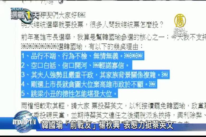 2020大選倒數最後一天,各路人馬都把握機會,舉辦選前之夜,進行最後一波造勢,國民黨總統候選人韓國瑜今天選在高雄夢時代拚場。接下來就由我們在夢時代現場的記者余宗翰,為您帶來,韓國瑜高雄選前之夜的最新情況。 //asset2.ntdtv.com.tw/public/uploads/assets/2020/01/10/2020-01-10-5e186a9027e73.mp4 韓國瑜|選前之夜|2020|2020總統大選2020-01-10 20:12:48