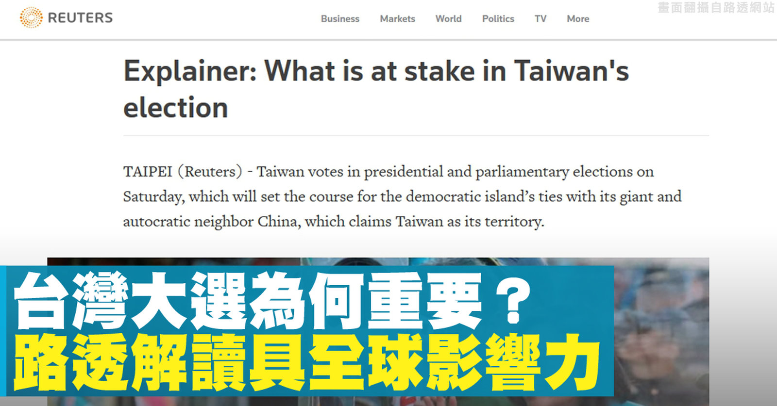台灣大選為什麼讓國際媒體這麼關注?路透社今天刊文點出重要性。在商業方面,台灣的高科技製造業,在全球供應鏈扮演關鍵角色,並且台灣也位於東南亞、美國、日本和南韓的重要運輸路線上。而在軍事上,台灣位處中國大陸外海和太平洋邊緣的戰略位置,是美國與中共可能爆發軍事衝突的地點,並位於爭議的南海海域上。同時,台灣也靠近美軍位於日本沖繩的基地。不管是中國大陸北京,還是美國華府,都密切關注台灣大選。《路透》更稱這場選舉將決定民主島嶼台灣和獨裁中共的關係,有潛在的全球影響力! //asset1.ntdtv.com.tw/public/uploads/assets/2020/01/10/2020-01-10-5e186df8d442c.mp4 2020|台灣|大選|總統|外媒2020-01-10 22:00:40