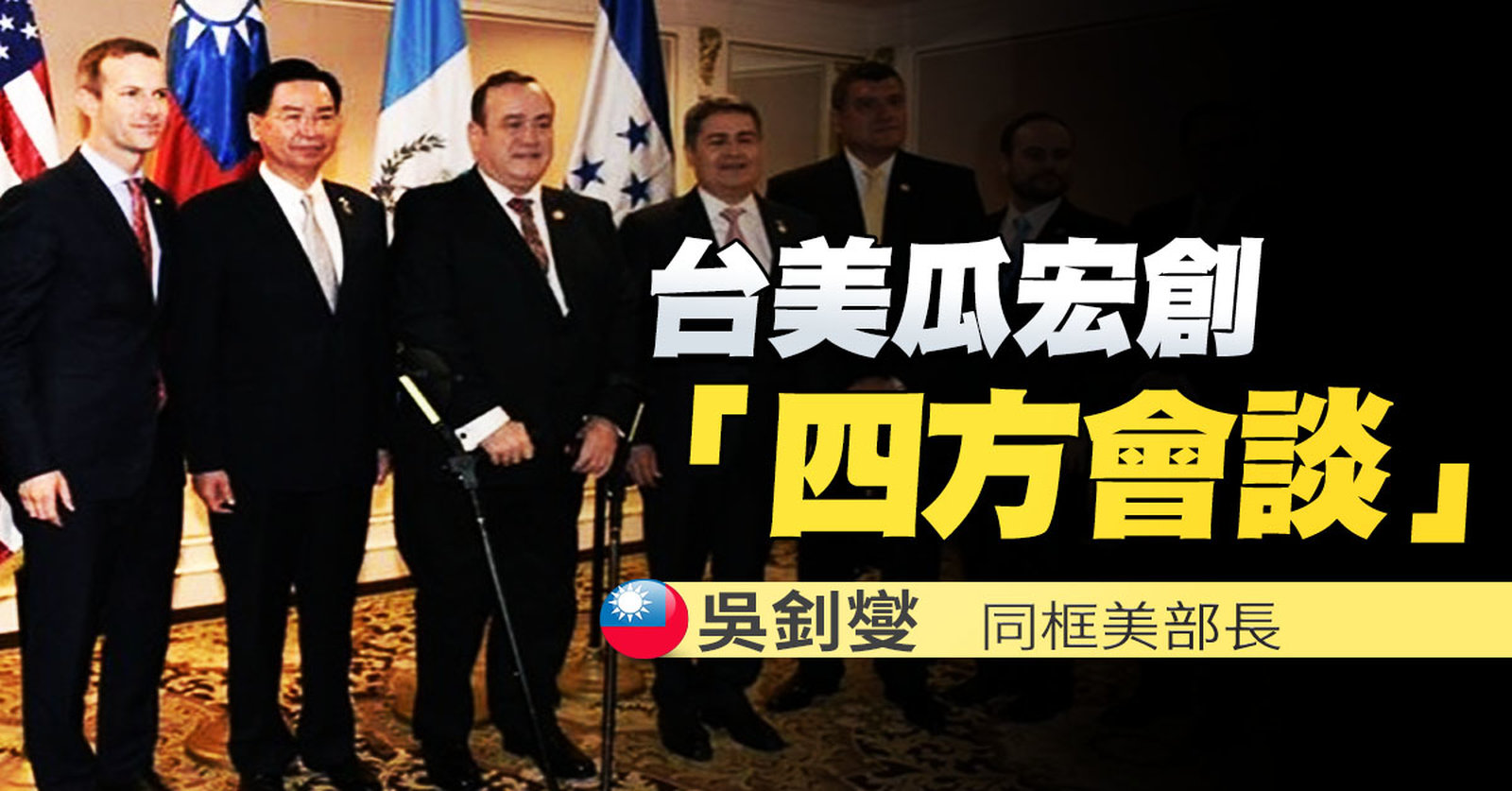 第一屆「臺灣、美國、瓜地馬拉及宏都拉斯四方會談」1月14日登場,創立多方合作機制,促進區域合作及發展。出席者包括中華民國吳釗燮、瓜國、宏國的總統與外長、美國國土安全部代理部長、及「國際開發金融公司」總裁。會場顯著擺設了中華民國等四國國旗。吳釗燮這次是擔任總統蔡英文特使,出席瓜國總統就職典禮、訪問宏都拉斯,此行會晤許多國際政要。 //asset2.ntdtv.com.tw/public/uploads/assets/2020/01/17/2020-01-17-5e21a53ecf565.mp4 中美洲|四方會談|拉丁美洲|台美關係2020-01-17 20:11:46