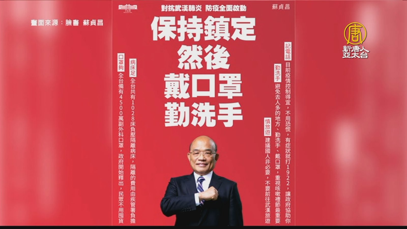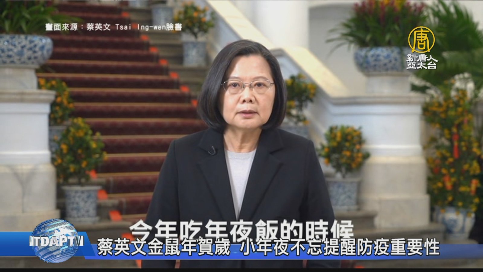 台灣走過總統大選,迎接傳統過年節慶,總統蔡英文在小年夜(23)這一天,也釋出賀歲影片,除了感謝堅守崗位的國軍、醫護同仁,也在臉書發文提醒防範武漢肺炎重要性,副總統陳建仁也呼籲民眾,過年期間,回國民眾,務必配合邊境發燒篩檢,共同防堵病毒入侵。 //asset3.ntdtv.com.tw/public/uploads/assets/2020/01/23/2020-01-23-5e29929d90711.mp4 蔡英文|陳建仁|疫情|武漢肺炎|新冠2020-02-14 13:52:57