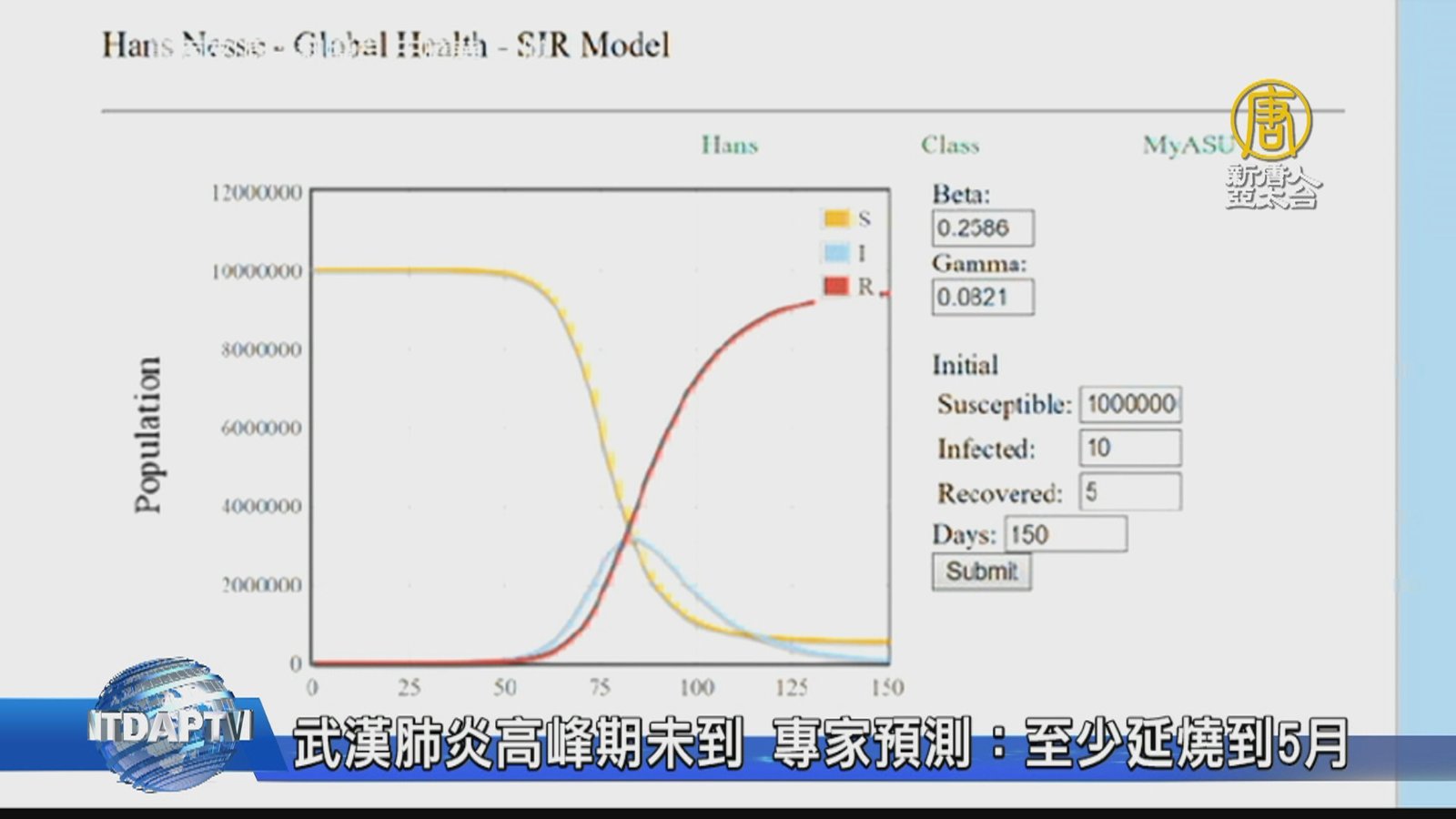 好,中共官方再次更新診療方案。目前無華南市場暴露史病例在增加,也出現了聚集性病例和無武漢旅行史的確診病例。外界都在觀察,武漢肺炎疫情的最新動態,但其實中國大陸有前線醫師透露,疫情其實已經傳播出去,甚至最高峰情況還沒到來,過年連假後恐怕就是最危險的時候,若無法控制,恐在2月中出現疫情大爆發的狀況。目前病例數量持續攀升,德國哥廷根大學(Gottingen University)經濟學系教授于曉華,在微博發文表示,他使用「SIR模型」模擬,指出疫情至少得延燒到五月份,預估50天爆發,90天達到高峰,醫療人員恐怕 //asset3.ntdtv.com.tw/public/uploads/assets/2020/01/23/2020-01-23-5e299b2e80914.mp4 武漢肺炎|疫情|中國大陸|中國|新冠2020-02-14 13:53:31