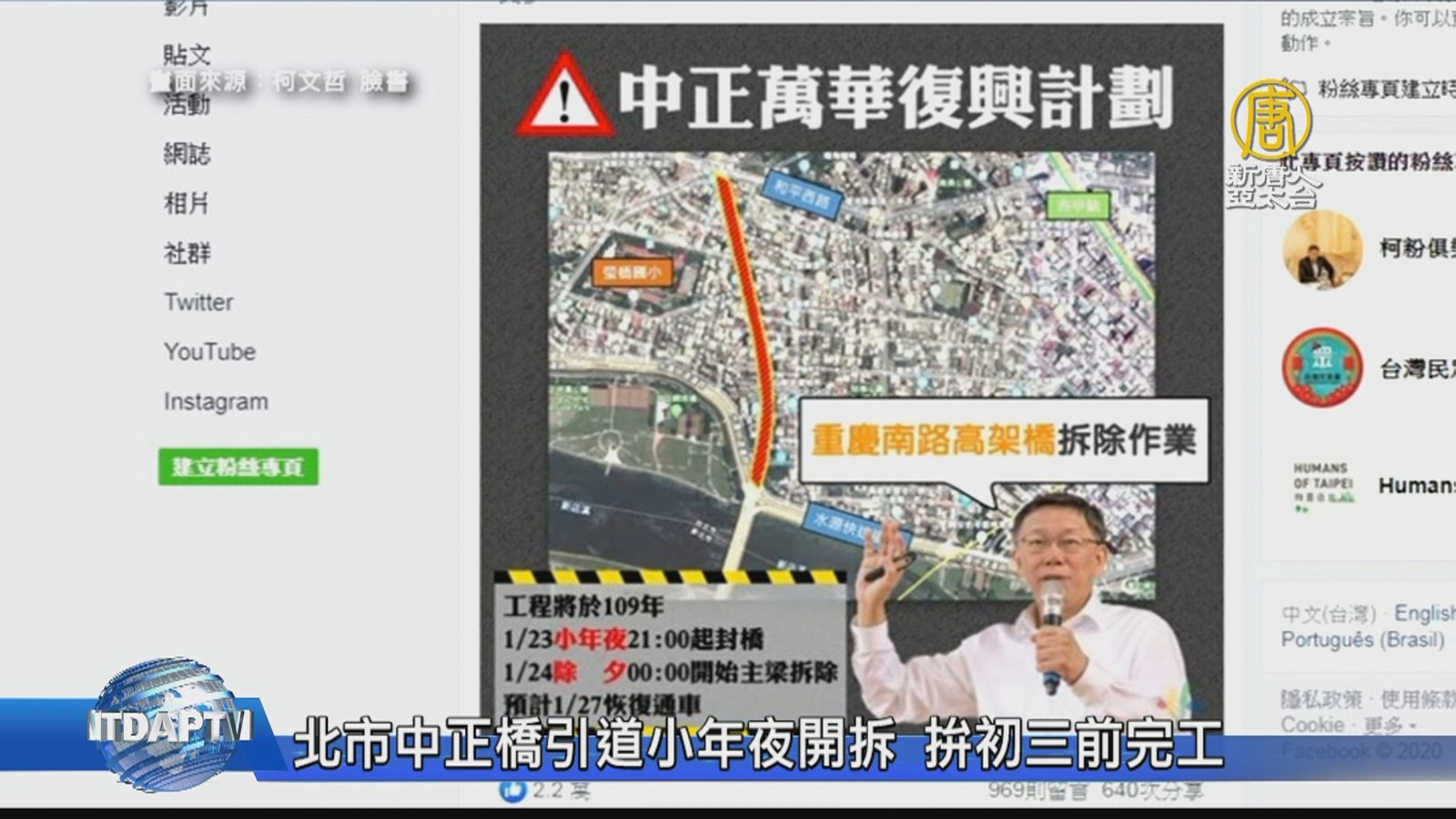 台北巿繼2016年過年期間拆除忠孝橋引道後,連接台北與新北永和區的中正橋高架引道,今晚也將進行拆除,預計27日完工,台北市長柯文哲今天受訪時表示,這種交通要道一年當中只有這個時間可以做,對於工作同仁必須24小時趕工不能休假,只能先說感謝。 //asset3.ntdtv.com.tw/public/uploads/assets/2020/01/23/2020-01-23-5e29999693e57.mp4 台北市|重慶南路高架橋|中正橋|引道|柯文哲2020-01-23 20:59:46