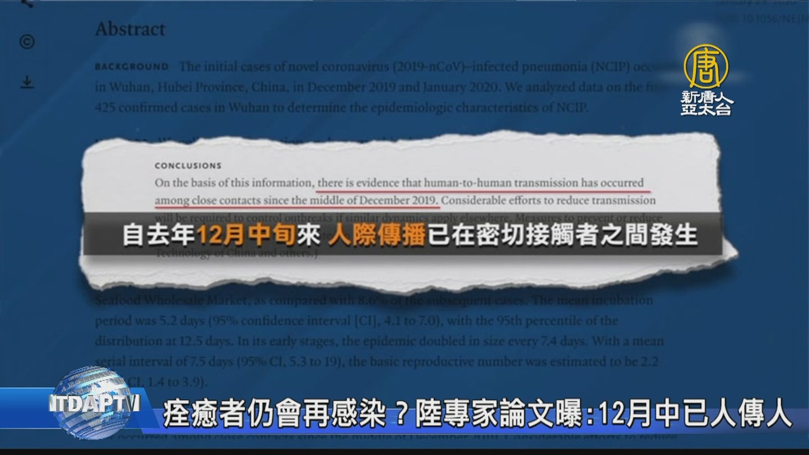 中共衛健委今天(31日)再度舉行記者會,宣稱武漢肺炎患者痊癒後,還是有再次感染的風險,引發關注,不過,外界仍質疑中共官方隱瞞不通報,中共疾病控制中心專家,日前在海外醫學期刊發表論文透露出,去年12月就已發生肺炎「人傳人」。 //asset3.ntdtv.com.tw/public/uploads/assets/2020/01/31/2020-01-31-5e341cdac949f.mp4 武漢肺炎|醫學期刊|新英格蘭雜誌|隱瞞疫情|防疫|中共|新冠2020-02-14 15:47:15