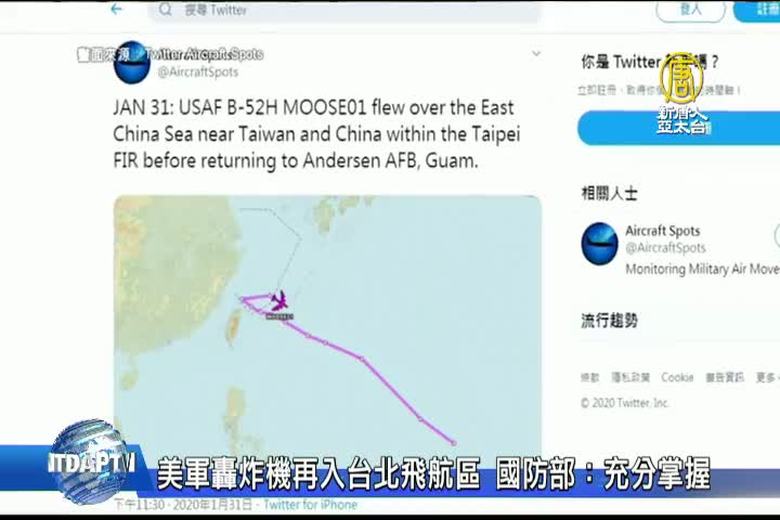 美軍B-52H轟炸機再度傳出進入台北飛航區,知名航機追蹤推特「飛機守望」昨天(1/31)披露,美軍一架轟炸機進入台北飛航情報區;國防部發言人史順文少將今天表示,國軍充分掌握海、空動態,請民眾放心。「飛機守望」去年12月5日也曾披露,美軍兩架B-52H轟炸機從關島起飛後,進入台北飛航情報區巡航再飛返安德森空軍基地。 //asset2.ntdtv.com.tw/public/uploads/assets/2020/02/01/2020-02-01-5e357186f2098.mp4 美軍B-52H轟炸機|台北飛航區|飛機守望AircraftSpots|國防部2020-02-01 20:35:29