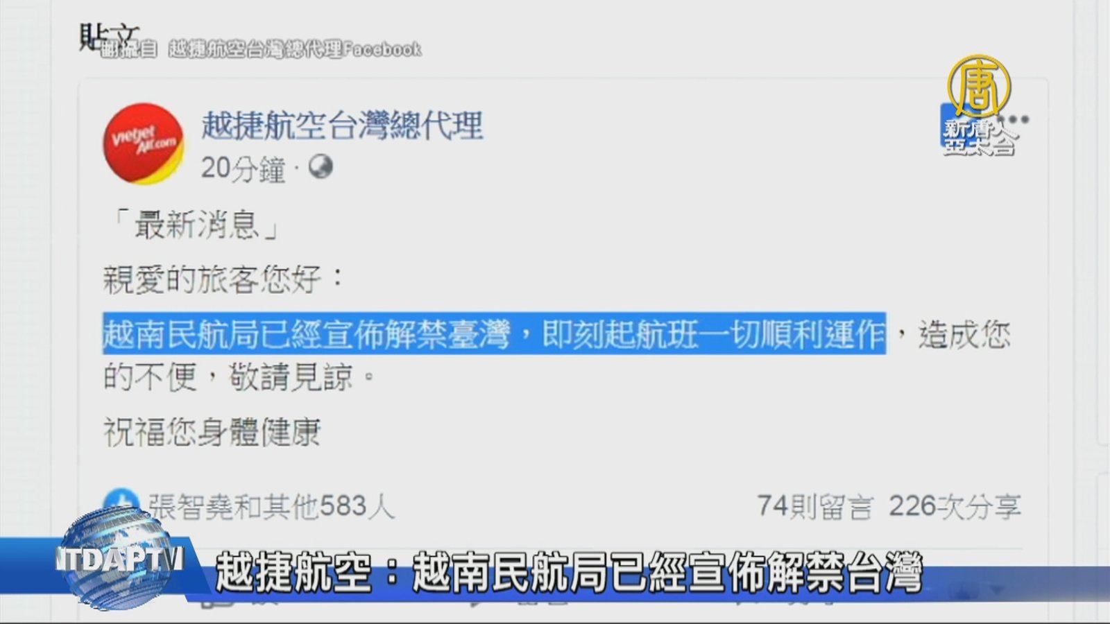 越捷航空:越南民航局已經宣佈解禁台灣