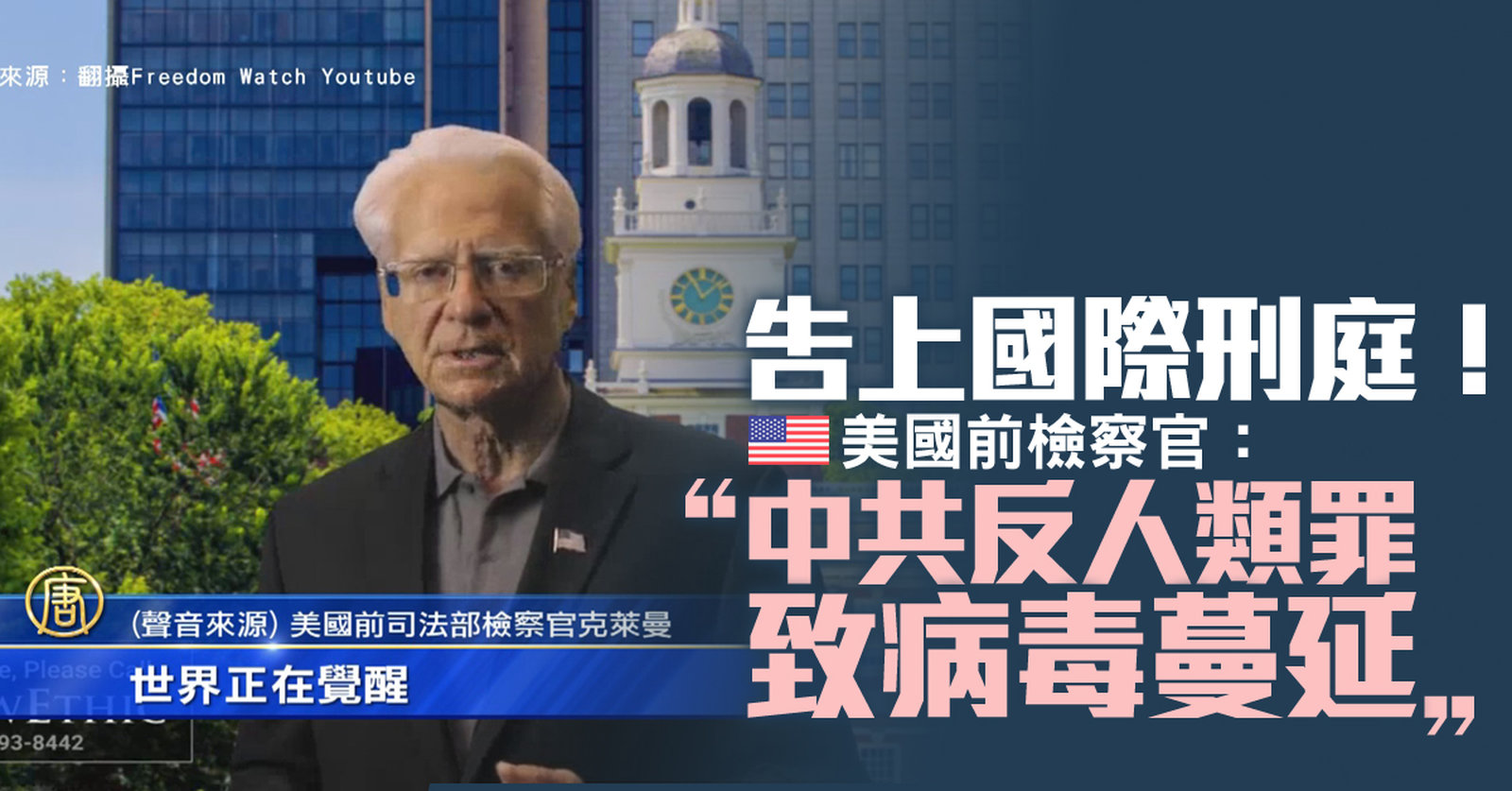 美國前司法部檢察官克萊曼6日表示,上週向ICC國際刑事法院提告,(6日)已收到法院通知。他控告中共政府與共軍,違反國際公約製造生物武器、犯下反人類罪,造成中共肺炎,危害中國人與世界。克萊曼說,他有信心ICC會啟動刑事調查;他強調,中國人民很好,但邪惡的中國共產黨,必須向法院與上帝交代。 //asset2.ntdtv.com.tw/public/uploads/assets/2020/04/07/2020-04-07-5e8c75715a9cd.mp4 中共肺炎|武漢肺炎|生化武器|國際刑事法院|集體訴訟|反人類罪|中共病毒|新型冠狀病毒|中國共產黨2020-04-07 21:13:52