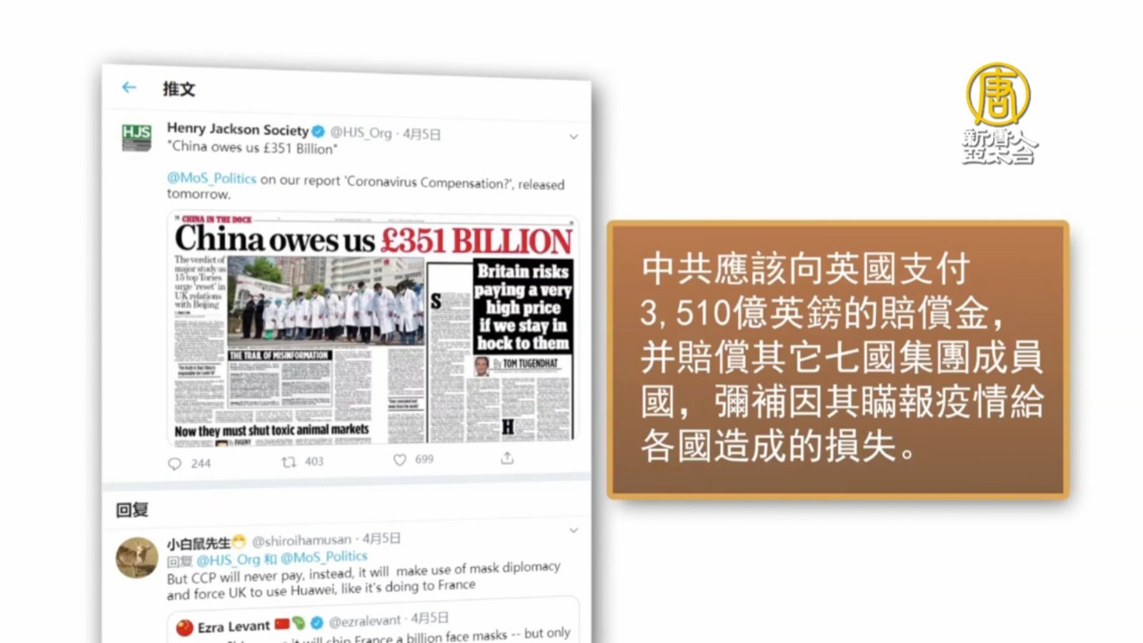 中共病毒令全球受害,各國死傷慘重、連帶經濟也遭受巨大衝擊。最近,美國、英國和印度的政界、法律界都紛紛要求中共,就瞞報疫情所造成的損失,做出賠償。 //asset2.ntdtv.com.tw/public/uploads/assets/2020/04/07/2020-04-07-5e8c7b6a53b35.mp4 美國|英國|印度|中共肺炎|武漢肺炎|疫情|防疫|中共病毒|新型冠狀病毒2020-04-07 21:03:34
