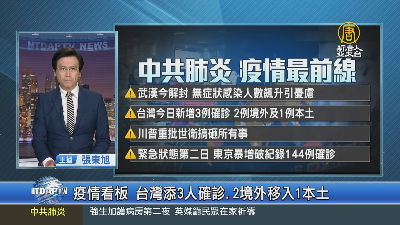 新聞首先帶您快速來看,今日疫情重點:武漢解封,無症狀感染人數飆升,引外界憂慮。台灣今日新增3例確診 2例境外及1例本土,累計379例。美國總統川普重批世界衛生組織,搞砸所有事。日本進入緊急狀態第二日,東京暴增破紀錄,有144例確診。 //asset1.ntdtv.com.tw/public/uploads/assets/2020/04/08/2020-04-08-5e8dbe634854b.mp4 中共肺炎|武漢肺炎|疫情|防疫|中共病毒|新型冠狀病毒2020-04-08 20:06:31