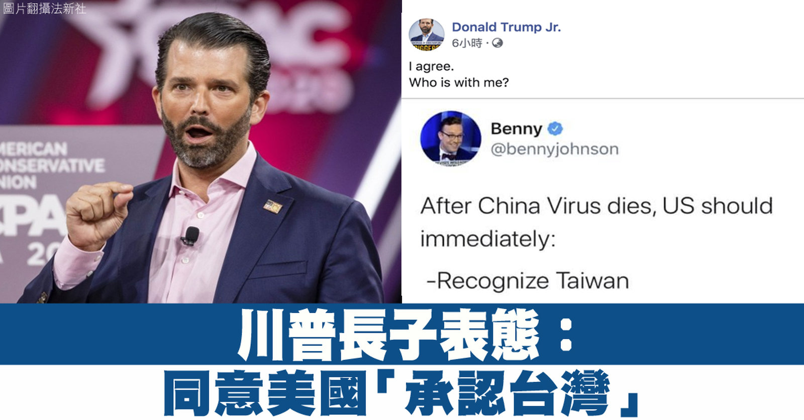 中共病毒疫情延燒,美中先前還為病毒起源槓上。美國總統川普的長子小唐納(Donald Trump Jr.)周四(4/9)轉發一則美國保守派專欄作家的發文,包括同意美國正式承認台灣為國家。小川普除了說「我同意」,還問說「誰也是?」。貼文被上萬人轉分享。 //asset2.ntdtv.com.tw/public/uploads/assets/2020/04/10/2020-04-10-5e906d6be8705.mp4 2020-04-10 23:44:55