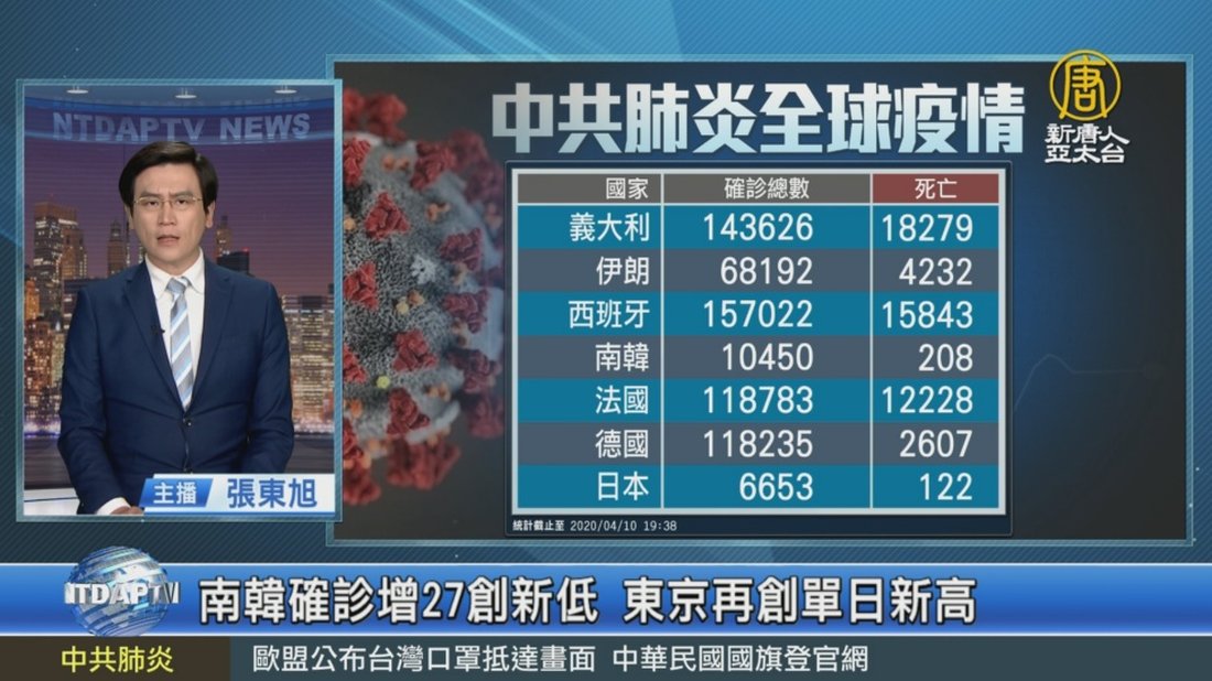 再來看到,中共肺炎在部分國家的災況:義大利新增確診4千2百多例、610死,累計確診達14萬3千626例、死亡1萬8千279人。西班牙確診累計15萬7千022人,1萬5千843人死亡。法國確診達11萬8千783例、死亡1萬2千228人。被國際質疑嚴重低報的伊朗官方公布,累計確診6萬8192例,死亡4千232人。另外,南韓新增27例確診,累計達1萬450例、208死亡,這是從2月20日以來的最低點,其中重災區大邱市,首次沒有新增個案。而日本東京今天新增189例確診,再創單日確診數新高,日本累計確診達6千653 //asset2.ntdtv.com.tw/public/uploads/assets/2020/04/10/2020-04-10-5e9064001f33e.mp4 中共肺炎|武漢肺炎|全球|義大利|南韓|東京|防疫|中共病毒|新型冠狀病毒2020-04-10 20:16:24