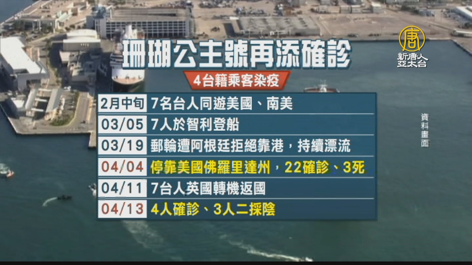 再來關心,台灣最新疫情,指揮中心今天(13日)公布新增五起境外移入案例,當中有四名是珊瑚公主號郵輪的乘客,另一人則是長年居住在美國,為先前確診案例的家人。目前全台累計393人確診,已經有114人解除隔離出院。 //asset2.ntdtv.com.tw/public/uploads/assets/2020/04/13/2020-04-13-5e9457500f3fa.mp4 中共肺炎|武漢肺炎|疫情|防疫|珊瑚公主|遊輪2020-04-13 20:22:00