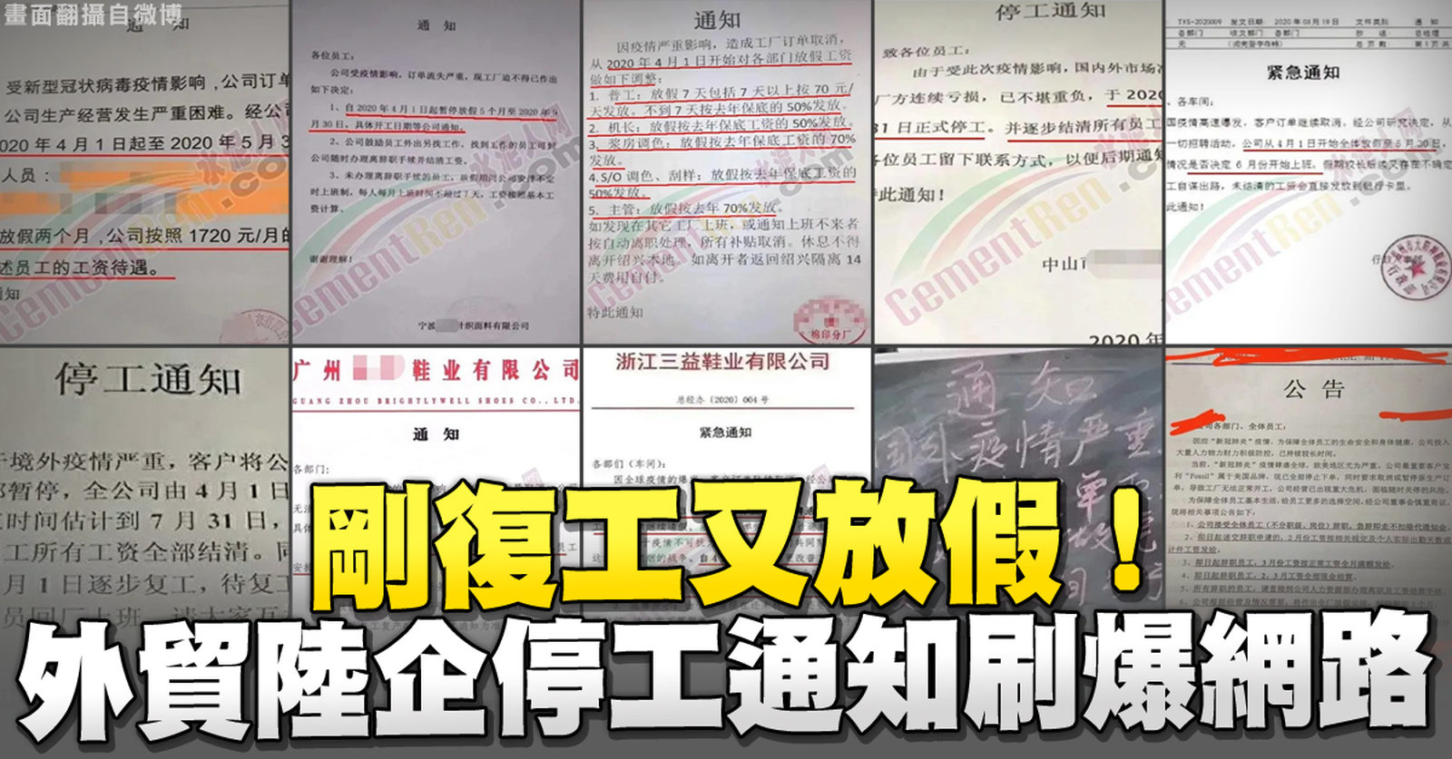 中共病毒疫情重創大陸經濟。近日,很多企業的「停工通知」在網絡曝光,均從3月末至4月初開始再次停工,復工之日遙遙無期。外貿企業「無工可復」的危機也因此登上熱搜榜,引發數千萬網友關注。 //asset3.ntdtv.com.tw/public/uploads/assets/2020/04/13/2020-04-13-5e945f4de11db.mp4 2020-04-13 21:59:42