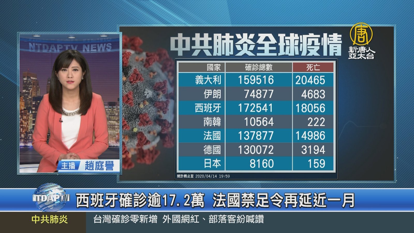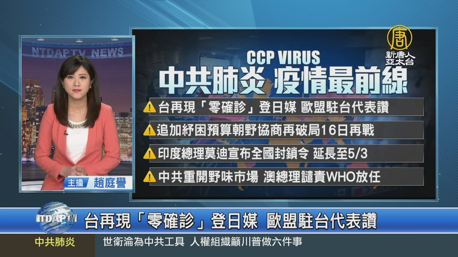 新聞首先來看到,全球有超過192萬人感染中共肺炎,超過12萬人死亡,快速瀏覽,今天的疫情追蹤重點,台灣相隔「36天」再度零確診,消息迅速登上日本媒體,歐盟駐台代表高哲夫,也在推特稱讚台灣表現,成功控制了外來的感染源,如同守住首波來自中國的感染。立法院朝野協商再破局,追加紓困預算今天無緣三讀,16日將再度協商。印度總理莫迪,今天宣布延長鎖國期限到5月3日。澳洲總理莫里森譴責世界衛生組織(WHO),放任中共當局重開野味市場的舉動「難以理解」。 //asset2.ntdtv.com.tw/public/uploads/assets/2020/04/14/2020-04-14-5e95a88e1d97a.mp4 中共肺炎|武漢肺炎|疫情|防疫|中共病毒|新型冠狀病毒2020-04-14 20:14:56