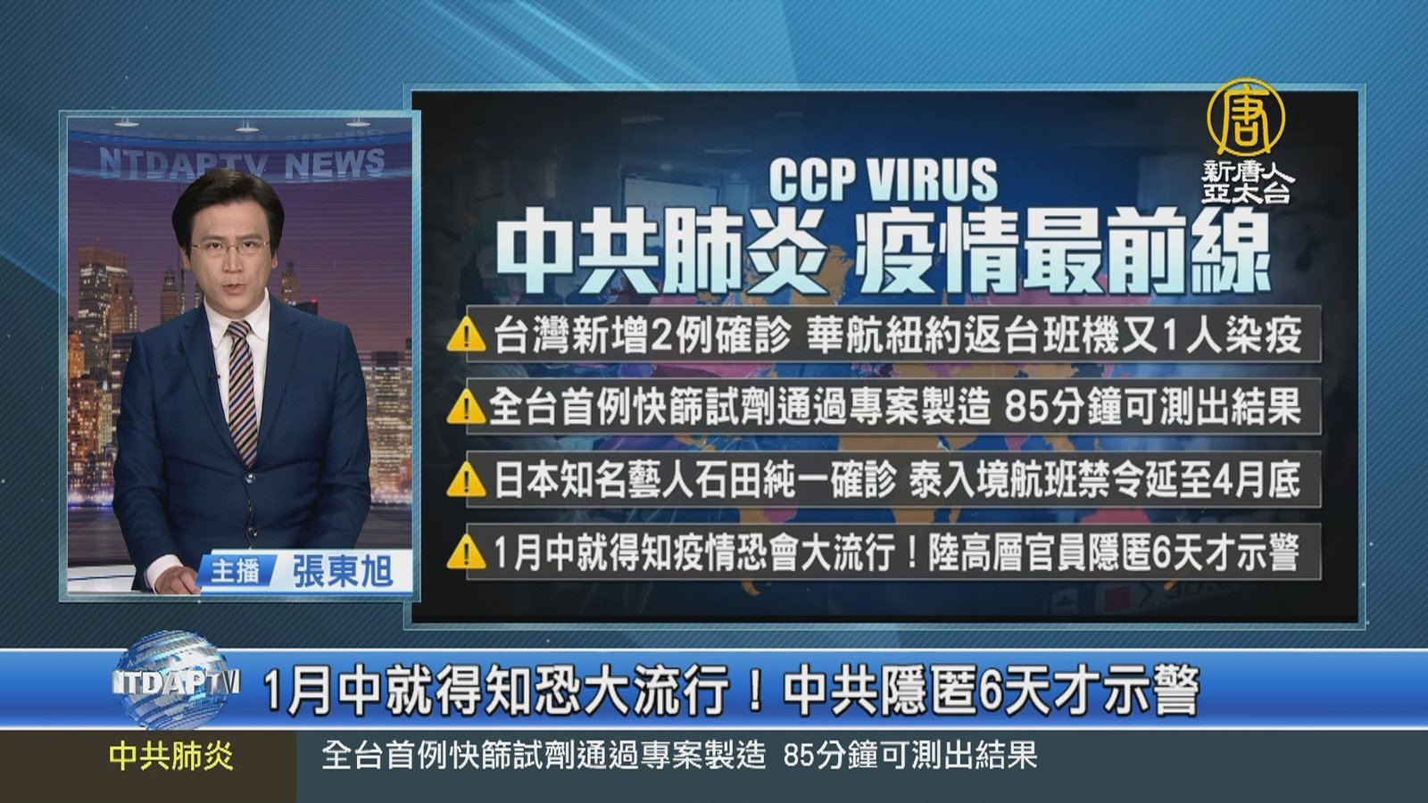 新聞一開始,先來瀏覽今日疫情重點:台灣新增2例境外移入確診,華航紐約返台班機又1人染疫。全台灣首例快篩試劑,通過專案製造, 85分鐘,就可測出結果。日本藝人石田純一確診。泰國入境航班禁令,將延至4月底。美聯社披露,中共官員1/14就已經知道疫情嚴重,卻隱匿了6天才示警。 //asset3.ntdtv.com.tw/public/uploads/assets/2020/04/15/2020-04-15-5e96f98da5a3b.mp4 中共肺炎|武漢肺炎|疫情|防疫|中共病毒|新型冠狀病毒2020-04-15 20:06:47