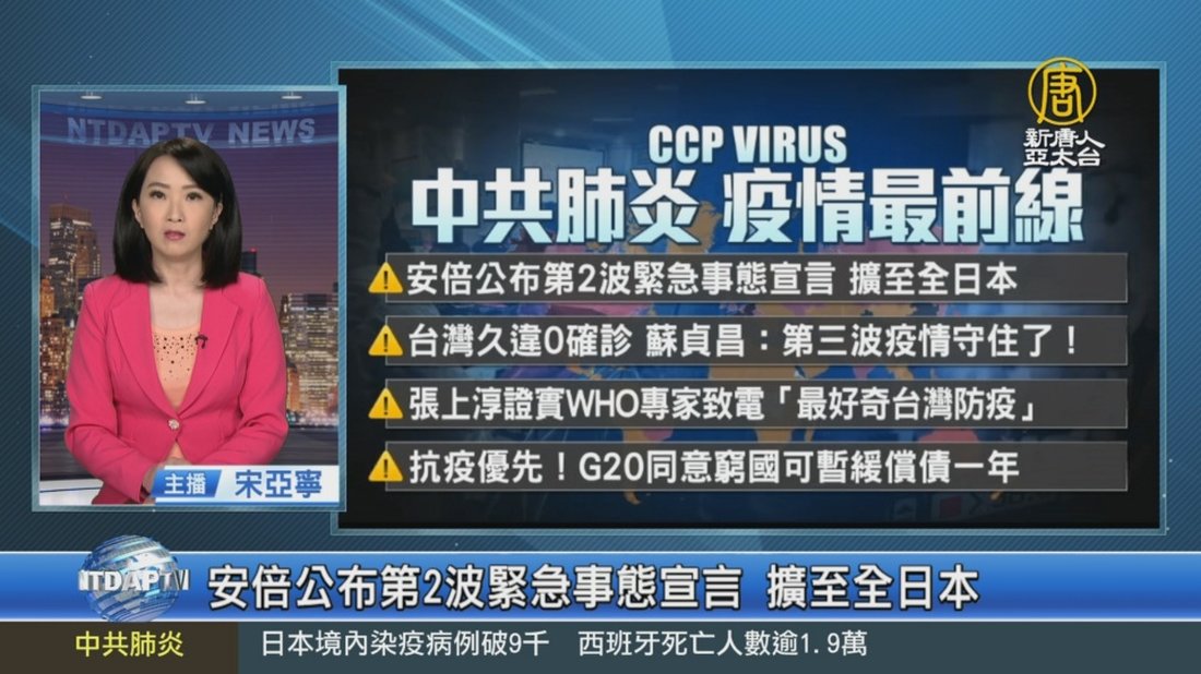 新聞首先帶您快速瀏覽,今天的疫情重點,全球有超過206萬人感染中共肺炎,超過13萬人死亡,日本首相安倍晉三,晚間正式宣布將「緊急事態宣言」擴大到全日本47都道府縣,暫訂實施到5月6日為止。台灣三天兩度0確診,行政院長蘇貞昌說,先前擔心清明連假後的第三波疫情挑戰,現在看起來有守住了!「專家諮詢小組」召集人張上淳證實:WHO昨天與台灣接洽電話會議,盼專家小組參與更多會議,他們也好奇台灣防疫怎麼這麼好。G20同意窮國可暫緩償債一年,讓他們先對抗疫情和全球的「經濟海嘯」。 //asset2.ntdtv.com.tw/public/uploads/assets/2020/04/16/2020-04-16-5e984b14772da.mp4 中共肺炎|武漢肺炎|疫情|防疫|中共病毒|新型冠狀病毒2020-04-16 20:07:11