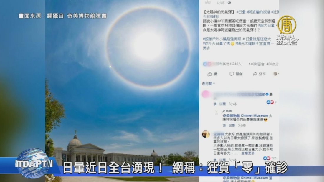 再來看到,最近,台灣各地頻頻出現「日暈」美景,今天中午台南也出現了日暈,民眾看到後都喜出望外,直呼驚奇!紛紛拍下照片、影片上網分享!不少民眾認為是好兆頭,在台南奇美博物館的臉書照片中,可以清楚看出,日暈相對底下的建築物是相當的巨大驚人。小編也以「太陽神的元氣彈」、「阿波羅的祝福」形容日暈美景,並且tag狂賀台灣再次出現今日「零」確診。其實,台灣從週一(13日)開始,屏東、高雄等地就多次出現日暈。恆春氣象站表示,屏東地區短短4天內出現多次日暈,相當罕見。 //asset3.ntdtv.com.tw/public/uploads/assets/2020/04/16/2020-04-16-5e9859234e17a.mp4 日暈|零確診|奇美博物館2020-04-16 21:09:55
