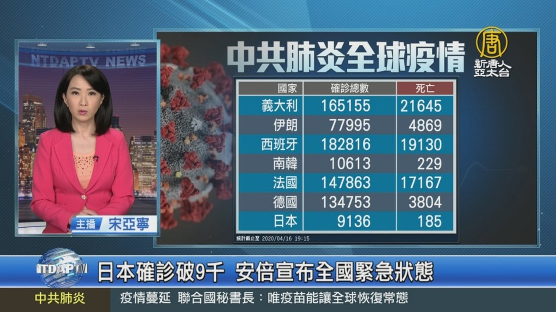 再來看到,中共肺炎在部分國家的災況:義大利新增確診2千667例,累計達16萬5千155例、2萬1千645死,日增確診數再創新低。西班牙新增5千183例確診,累計達18萬2千816例,1萬9千130人死亡。法國累計確診達14萬7千863例,死亡1萬7千167人。法國航空母艦「戴高樂號」合計近2千名官兵中,至少有668人確診。南韓新增確診22例,連續4天都維持在30例以下,至今累計確診1萬613例,死亡229人。而日本境內確診突破9千,累計達9千136人,死亡185人。因為各地疫情不斷擴大,日本首相安倍晉三今 //asset3.ntdtv.com.tw/public/uploads/assets/2020/04/16/2020-04-16-5e984fc7b7790.mp4 中共肺炎|武漢肺炎|全球|日本|安倍晉三|緊急狀態|法國|防疫|中共病毒|新型冠狀病毒2020-04-16 20:25:54