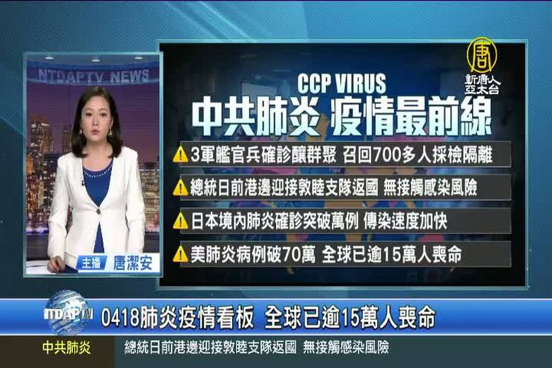 馬上先來帶您看到,今日疫情發展重點,台灣3軍艦官兵確診釀群聚風險,召回700多人採檢隔離。總統蔡英文日前港邊迎接敦睦支隊返國,無接觸感染風險。日本境內肺炎確診突破萬例,傳染速度加快。美國肺炎病例破70萬,全球已超過15萬人喪命。 //asset1.ntdtv.com.tw/public/uploads/assets/2020/04/18/2020-04-18-5e9aee468efa6.mp4 軍艦|確診|群聚|敦睦支隊|日本|美國中共肺炎|武漢肺炎|疫情|防疫|中共病毒|新型冠狀病毒2020-04-18 20:06:44