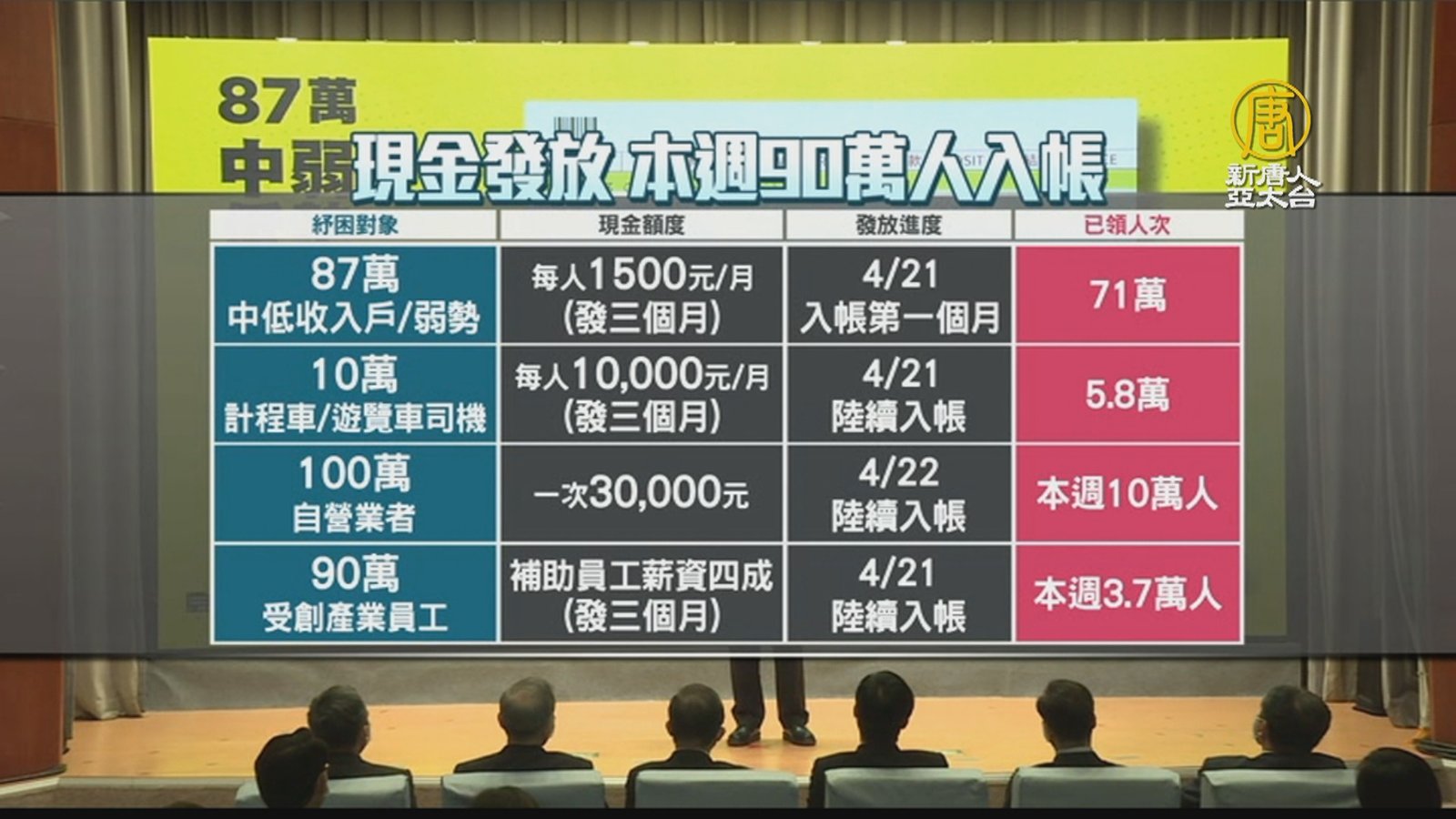 再來看到,台灣行政院的紓困2.0計畫全面啟動,院長蘇貞昌表示,包括中低收入戶與弱勢、計程車司機與遊覽車司機等,有90萬人本週現金入帳。 //asset2.ntdtv.com.tw/public/uploads/assets/2020/04/22/2020-04-22-5ea03879d06d6.mp4 紓困|行政院|蘇貞昌|防疫|中共肺炎|疫情2020-04-23 15:18:50