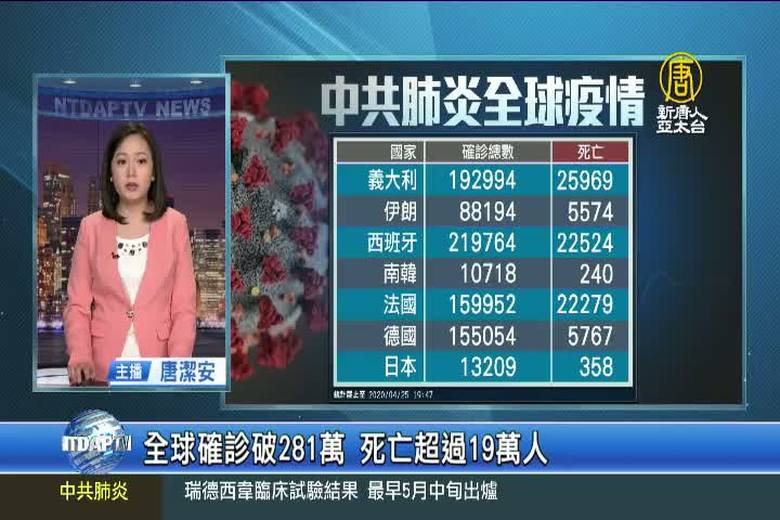 頭條新聞先帶您看到,全球確診感染中共肺炎的人數,超過281萬人 ,死亡超過19萬人。義大利累計確診19萬2千人、死亡2萬5千人。法國累計確診15萬9千人,死亡2萬2千人,法國衛生總署警告,病毒流行仍處在高峰,疫情依然嚴峻。另外,停泊在日本長崎維修的義大利郵輪 歌詩達大西洋號,確診再增近60人。 //asset1.ntdtv.com.tw/public/uploads/assets/2020/04/25/2020-04-25-5ea4282180572.mp4 中共肺炎|武漢肺炎|疫情|防疫|中共病毒|新型冠狀病毒2020-04-25 20:06:49