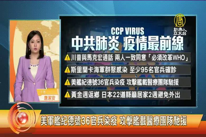 新聞首先快速瀏覽,中共肺炎最新重點。台灣今天再度零確診,總統蔡英文在臉書說「今天的幸運數字是:0」,並感謝國人配合,讓台灣守住疫情防線。台灣抗疫告捷,美國胡佛研究所學者歐斯林表示,中共肺炎疫情危機將改寫世界地緣政治,疫情處理得宜的台灣會受益,他也強調,華府應推動台灣加入世衛等國際組織。英國首相強生抗疫成功,今天重返工作崗位,透露鬆綁禁足令的5個條件。紐西蘭逐步解封,總理阿爾登宣布「戰勝社區感染」,而歐洲疫情重災區義大利、西班牙、法國,都將在5月解除封鎖。 //asset3.ntdtv.com.tw/public/uploads/assets/2020/04/27/2020-04-27-5ea6cb92a2c7b.mp4 中共肺炎|武漢肺炎|疫情|防疫|中共病毒|新型冠狀病毒2020-04-27 20:07:13