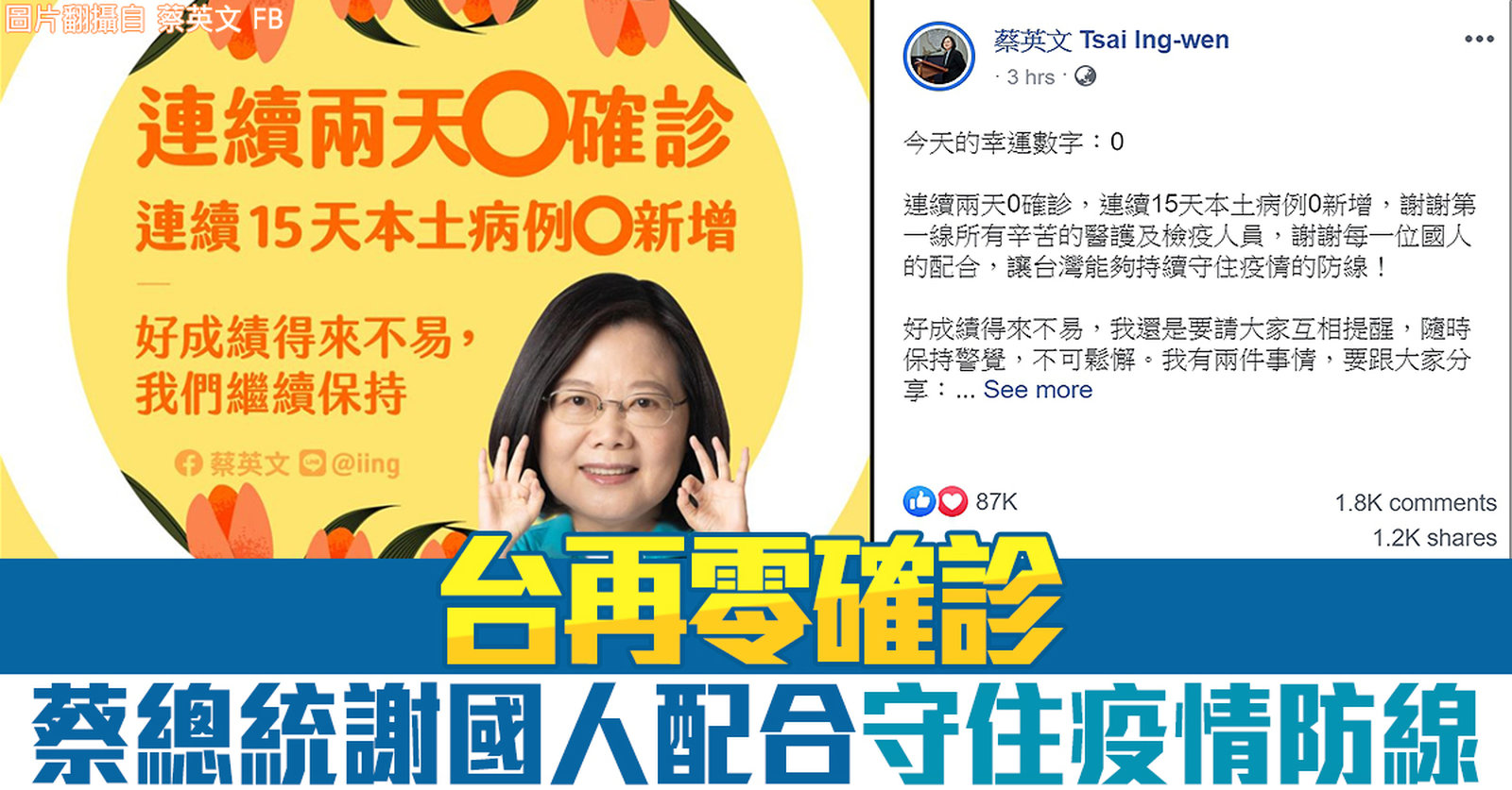 台再零確診 蔡總統謝國人配合守住疫情防線