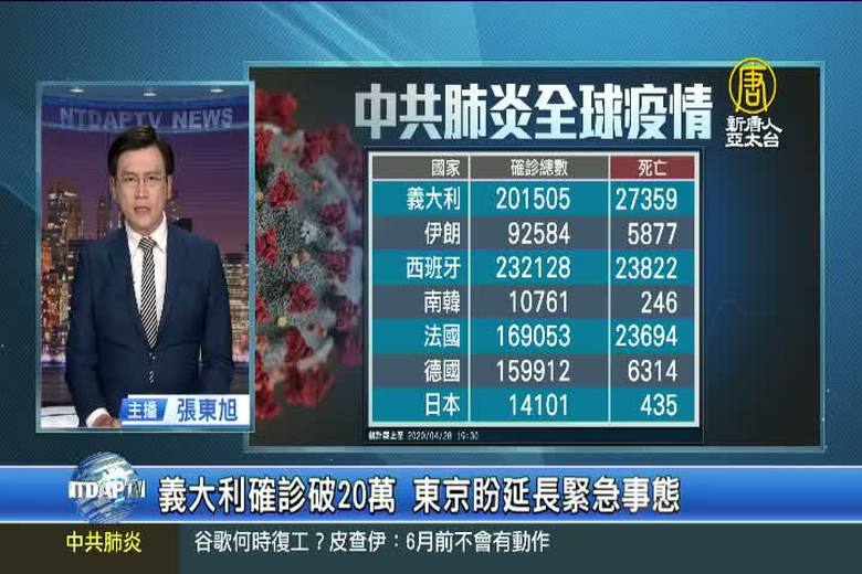 帶您看到,中共肺炎在部分國家的災況:義大利累計確診20萬1千505例、死亡2萬7千359人,成為繼美國、西班牙之後,第3個確診數突破20萬的國家。西班牙確診達23萬2千128人、死亡2萬3千822人,總理桑傑士宣布,將從5月4日起逐步解除全國封鎖措施,最慢6月底全面解封。日本確診達1萬4千101例、死亡435人,其中以東京超過4千1百例確診最為嚴重,東京都知事小池百合子希望中央政府延長「緊急事態宣言」期間。香港連續第4天零確診。而新加坡確診達1萬4千951例、死亡14人,新增病例數連續2天下降,為了遏止疫 //asset3.ntdtv.com.tw/public/uploads/assets/2020/04/29/2020-04-29-5ea982be5e4c9.mp4 中共肺炎|武漢肺炎|東京|香港|新加坡|疫情|防疫|中共病毒|新型冠狀病毒2020-04-29 21:32:33