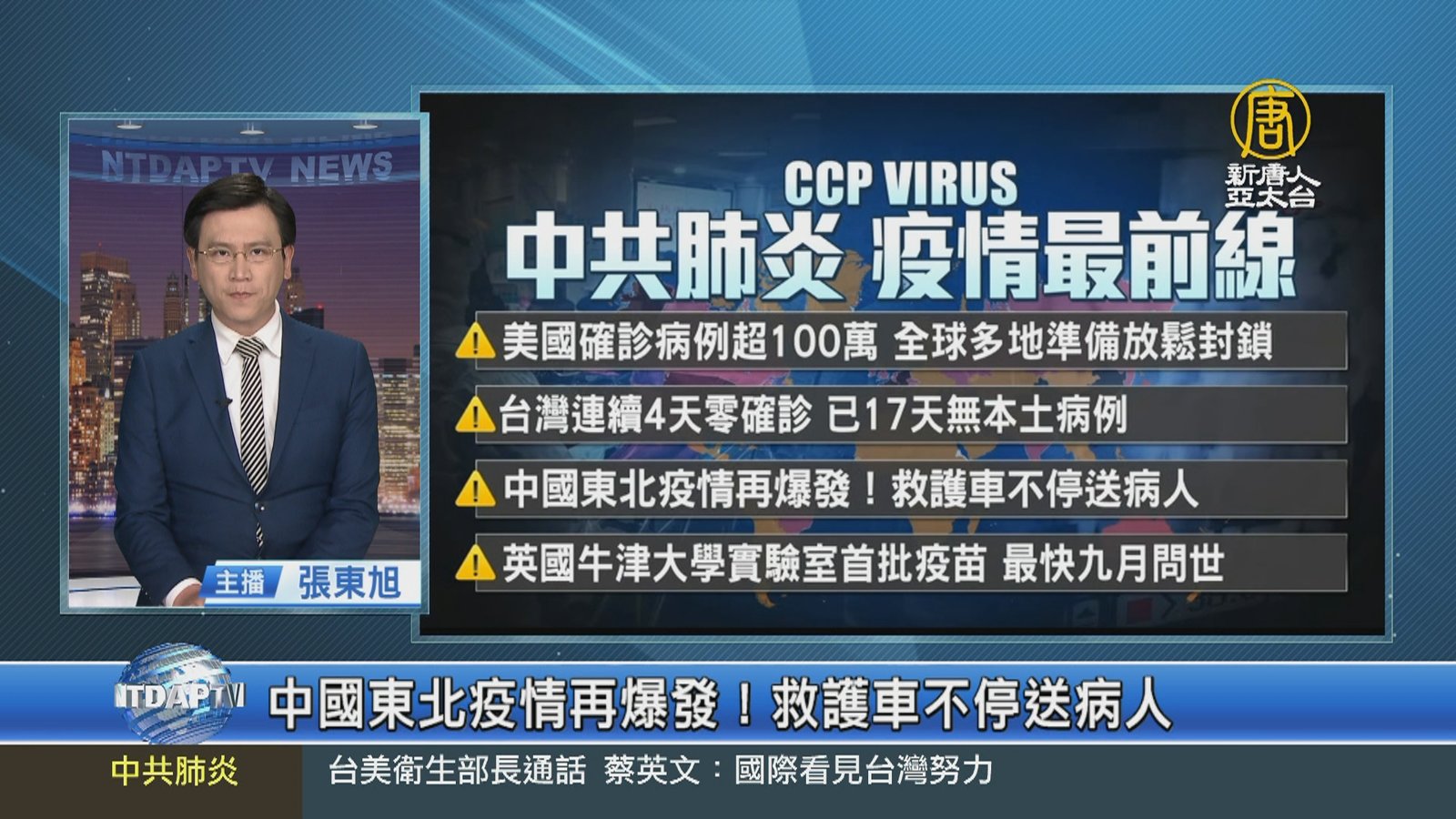 首先帶您快速瀏覽今天的疫情重點。美國確診病例已經超過100萬,全球多地準備放鬆封鎖。台灣連續4天零確診,已17天無本土病例。中國東北疫情再爆發!救護車不停送病人,哈爾濱醫院發燒門診暫停。英國牛津大學實驗室首批疫苗,最快今年的秋天就會問世。 //asset2.ntdtv.com.tw/public/uploads/assets/2020/04/29/2020-04-29-5ea96e4525349.mp4 中共肺炎|武漢肺炎|疫情|防疫|中共病毒|新型冠狀病毒2020-04-29 20:06:44