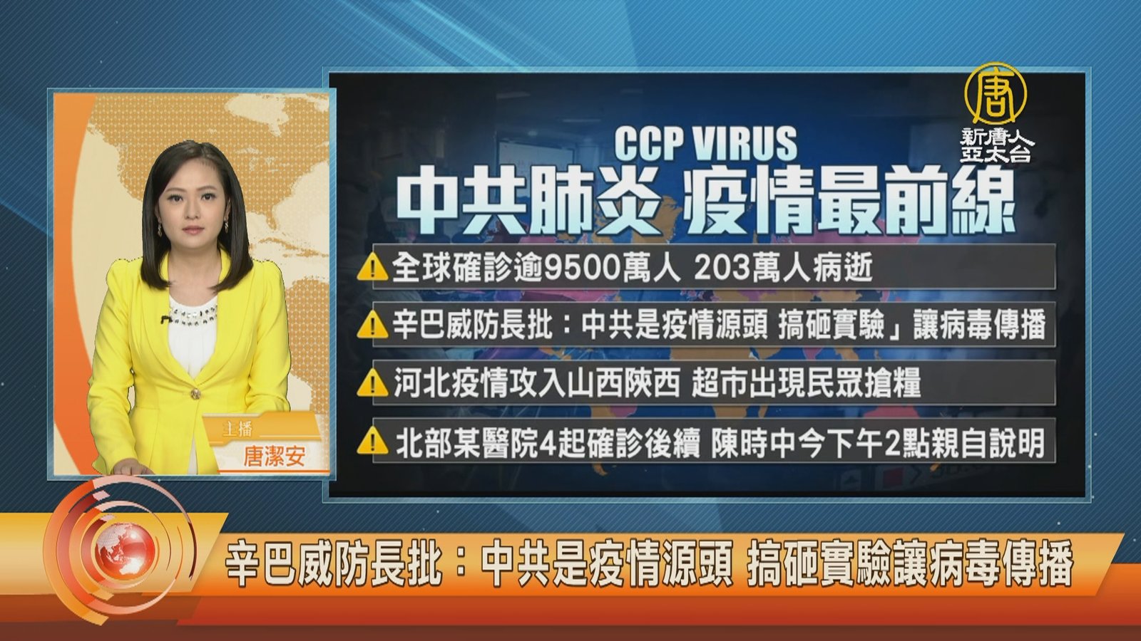 再來關心中共肺炎疫情最新情況,全球確診超過9千5百萬人,死亡2百多萬人。但中共、伊朗等國家,被認為嚴重低報數據。疫情最嚴重的美國目前累計確診超過2千3百93萬人,死亡 39萬7千多人。阿根廷出現首例英國變種病毒病例。比利時一家養老院超過1百人感染英國變種病毒。南韓則是出現首例巴西變種病毒確診,同時也新增1例南非變種病毒。變種病毒讓專家憂心將面對疫情更困難的大流行,歐盟國家領導人將緊急開會商討對策。日本東京連續6天超過1千例確診。香港新增107例確診,比昨天增加快近1倍,也是近一個月以來首次確診破百,其中有 //asset2.ntdtv.com.tw/public/uploads/assets/2021/01/18/2021-01-18-60057e767273e.mp4 美國|英國|確診|香港|英國變種病毒|巴西變種病毒|歐盟|南韓|中共肺炎|武漢肺炎|疫情|防疫|中共病毒|新型冠狀病毒2021-01-18 20:22:51