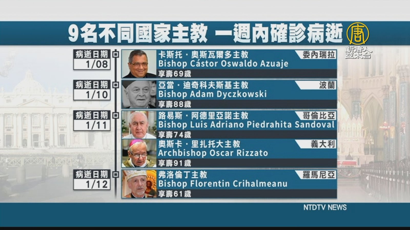 遭肺炎病毒奪命 天主教9名主教一週內染疫亡