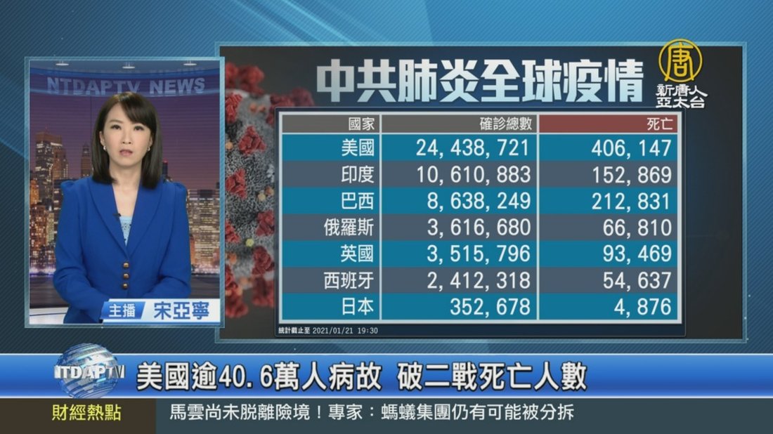 來關心中共肺炎疫情最新情況,全球確診超過9千6百91萬人,死亡2百07萬多人。但中共、伊朗等國家,被認為嚴重低報數據。疫情最嚴重的美國目前累計確診超過2千4百43萬人,死亡40萬6千多人,超過美軍在第二次世界大戰陣亡的人數。英國20日新增1千8百多人在染疫28天內病故,連續兩天刷新單日新增死亡紀錄。西班牙在過去7天通報1千1百多例死亡病例,創下去年11月以來的最高每週死亡人數。荷蘭政府宣布,預計將在週末實施二戰以來的首度全國宵禁。日本東京連續9天單日確診超過1千例,累計超過9萬例確診。 //asset3.ntdtv.com.tw/public/uploads/assets/2021/01/21/2021-01-21-600972c6afb87.mp4 美國|英國|西班牙|死亡|二次世界大戰|荷蘭|宵禁|東京|確診|變種病毒|中共肺炎|武漢肺炎|疫情|防疫|中共病毒|新型冠狀病毒2021-01-21 20:21:55