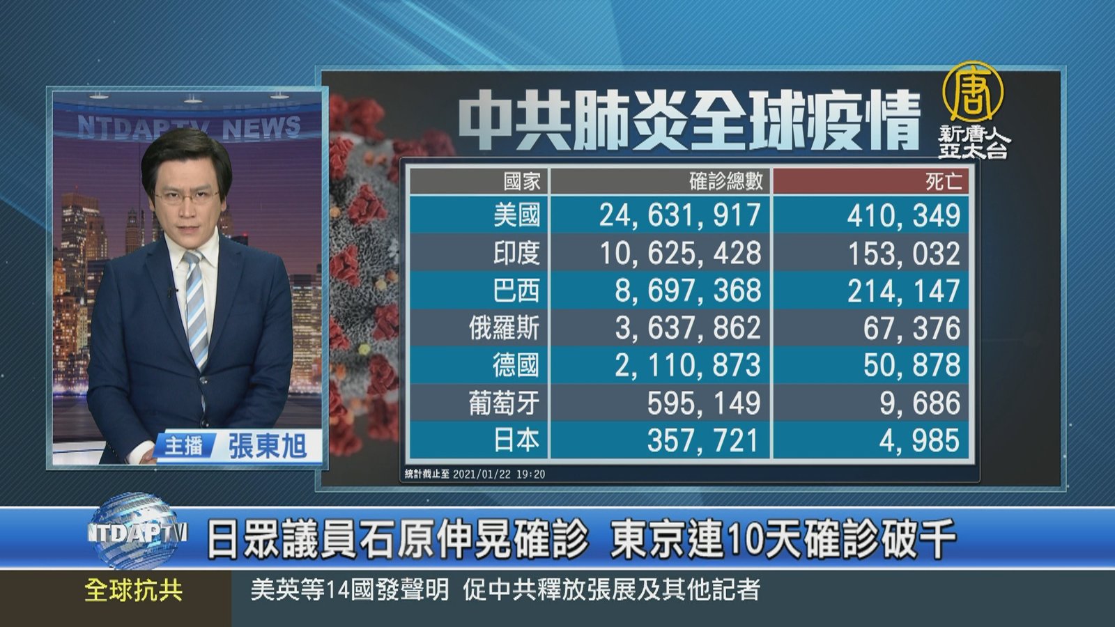 來關心中共肺炎疫情最新情況,全球累計確診超過9千7百56萬人,累計死亡2百09萬多人。但中共、伊朗等國家,被認為嚴重低報數據。疫情最嚴重的美國累計確診超過2千4百63萬人,死亡41萬多人。歐洲葡萄牙宣布,將加強封城措施,下令一些公共服務部門及全國學校關閉至少15天。捷克國會將緊急狀態延長到2月14日。日本對部分地區二度發布「緊急事態宣言」後已經2週,仍無法抑制疫情,疫情最嚴重的東京,已經連續10天單日新增超過千例確診,過去2週新增超過2萬例。日本前經濟再生大臣、眾議員石原伸晃確診,是第9位確診的日本國會議 //asset1.ntdtv.com.tw/public/uploads/assets/2021/01/22/2021-01-22-600ad00f8d21c.mp4 美國|葡萄牙|封城|日本|石原伸晃|確診|東京|澳洲網球公開賽|中共肺炎|武漢肺炎|疫情|防疫|中共病毒|新型冠狀病毒2021-01-22 21:15:59