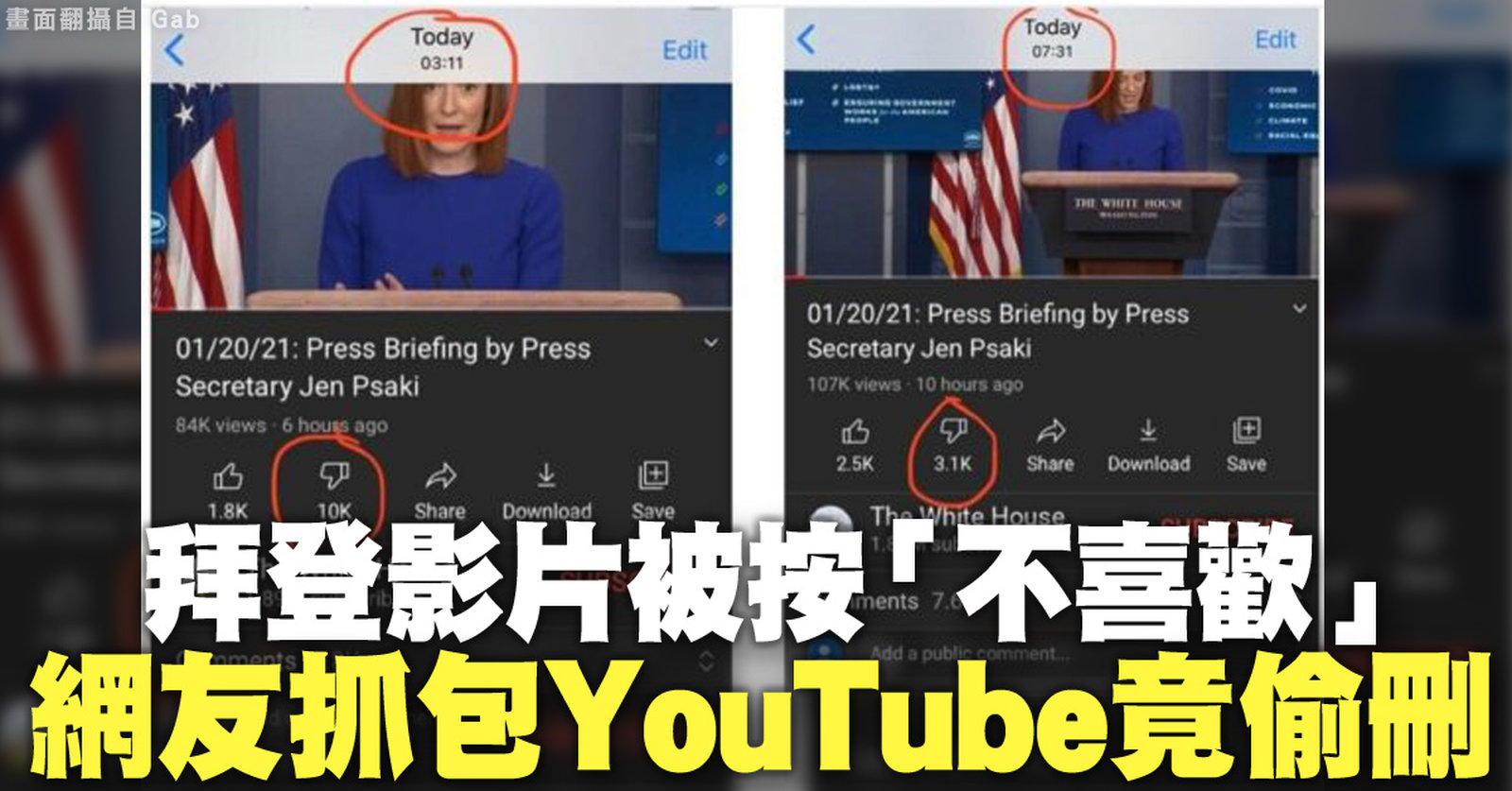 週三(1月20日),拜登入主白宮的第一天,白宮在Youtube官頻發布了它的首場新聞發布會影片,結果得到了1萬多個「不喜歡」,不足2千個「喜歡」。但有網友發現,Youtube在當天下午偷偷刪除了約7千個「不喜歡」,只剩下三千多個。 //asset1.ntdtv.com.tw/public/uploads/assets/2021/01/22/2021-01-22-600ad98c4c696.mp4 2021-01-22 21:39:33
