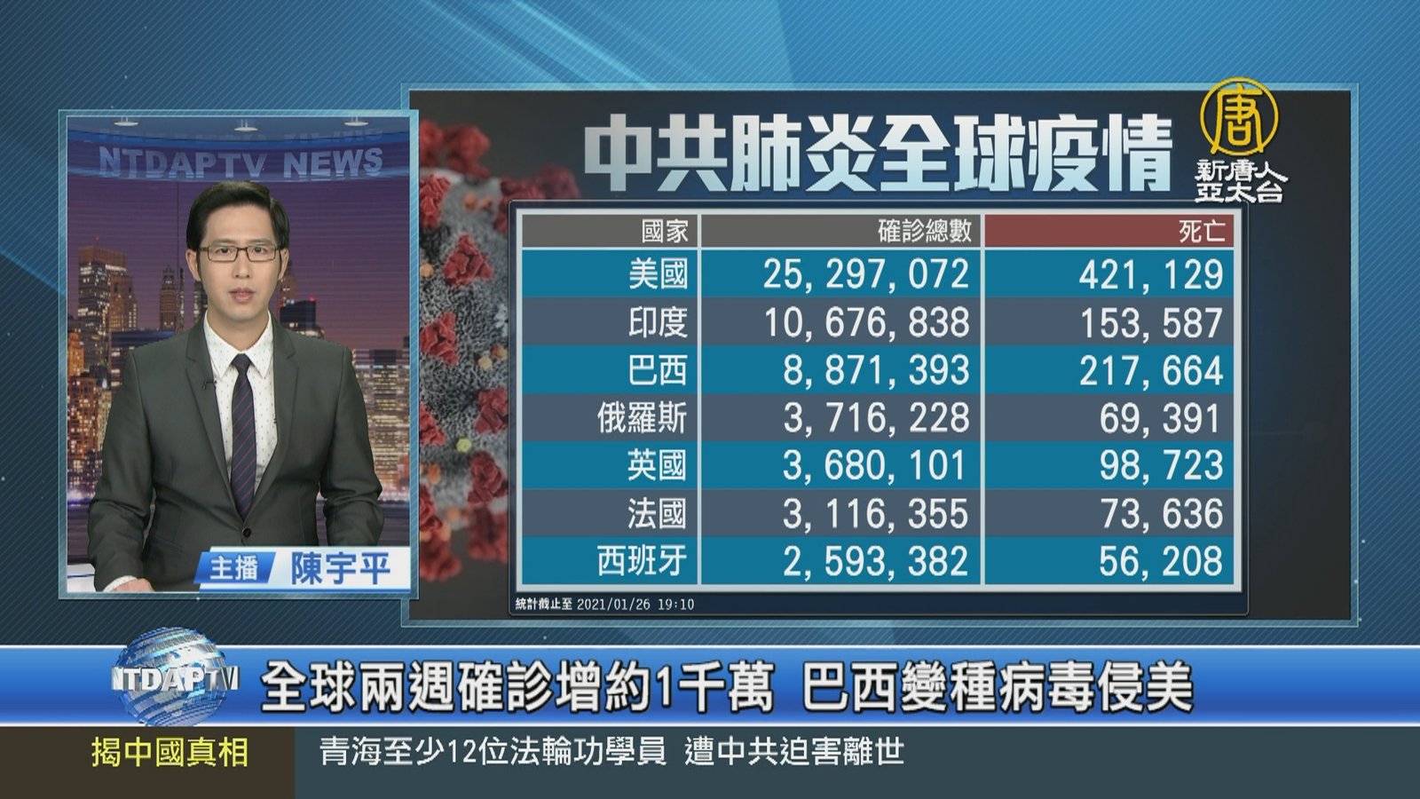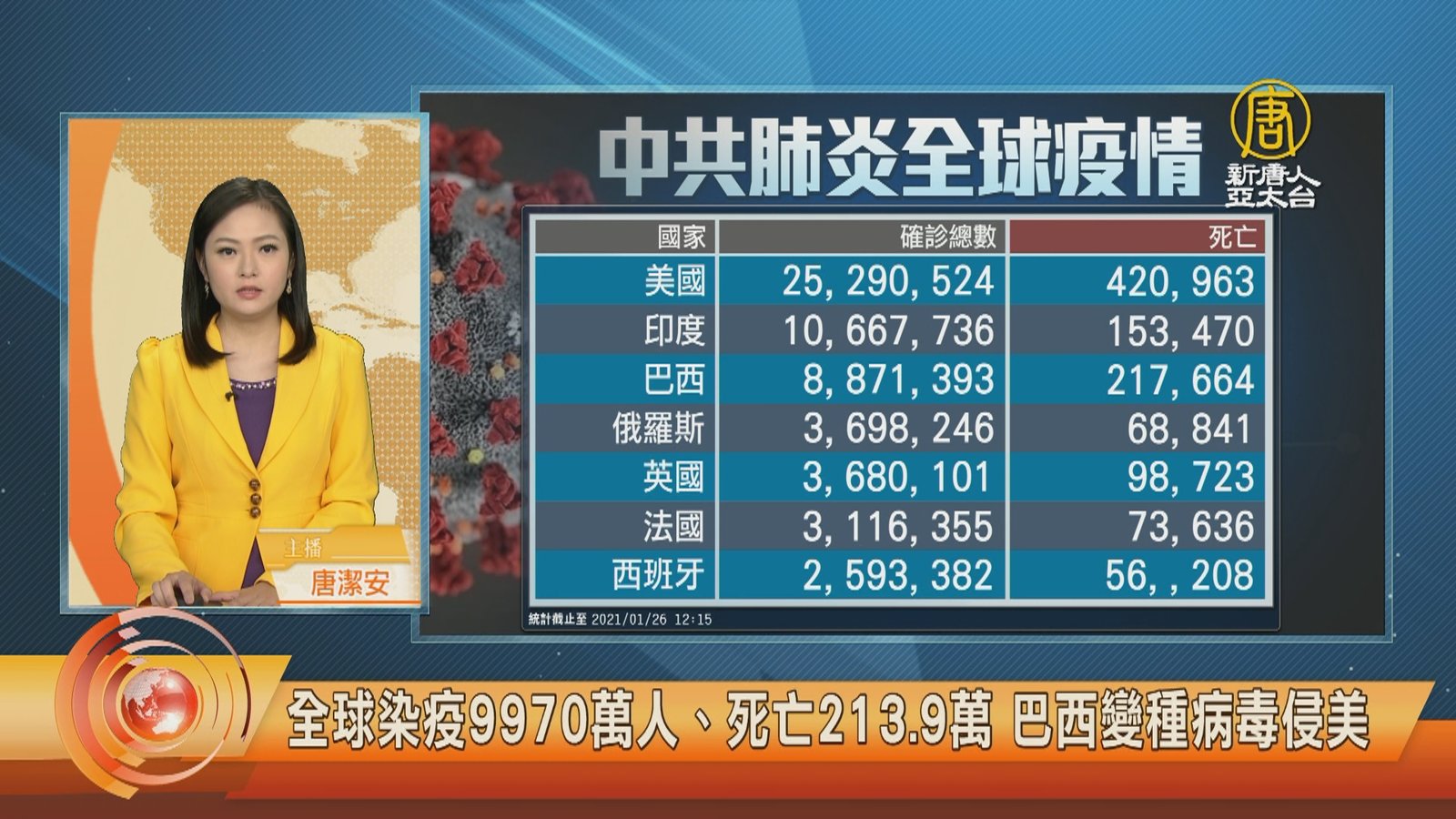 再來關心中共肺炎動態,目前全球公開數據,累計確診 9千9百77萬人,逼近1億人,在大約兩週內增加約1千萬例,累計死亡 2百14萬多人。其中,中共、伊朗等政權,被認為嚴重低報數據。美國累計確診 2千5百29萬例、死亡超過42萬人,明尼蘇達州出現首例巴西發現的變種病毒株。美國總統拜登25日提高疫苗接種目標,表示預計在春季為多數美國人提供疫苗,有望在夏天接近群體免疫。另外,葡萄牙過去一週,新增確診超過 8萬5千例,近1千5百人病故,單日死亡人數也在今天創下新高。另外,墨西哥總統24日宣布確診,目前症狀輕微。非洲 //asset2.ntdtv.com.tw/public/uploads/assets/2021/01/26/2021-01-26-601015ae52ae5.mp4 美國|確診|死亡|變種病毒|拜登|疫苗|群體免疫|中共肺炎|武漢肺炎|疫情|防疫|中共病毒|新型冠狀病毒2021-01-26 21:14:22