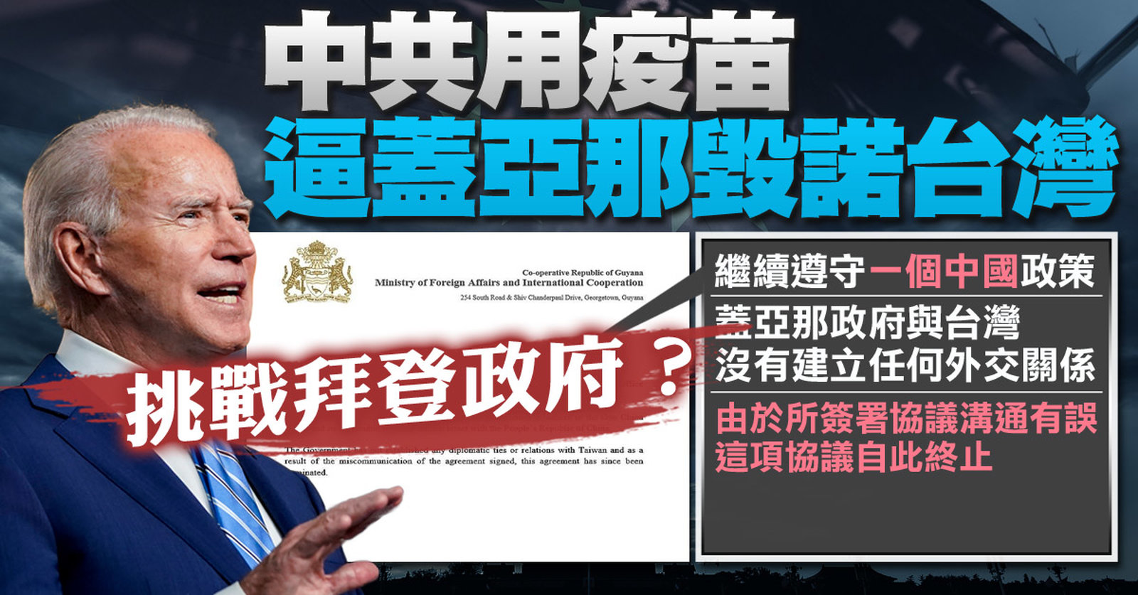 中華民國外交部4日宣布在蓋亞那設立「台灣辦公室」,卻在中共施壓、送疫苗後,蓋亞那突然終止,設立台灣辦公室的協議。副總統賴清德受訪表示,中共以人命當籌碼,大玩政治暗黑遊戲,國際社會應同聲譴責。 //asset1.ntdtv.com.tw/public/uploads/assets/2021/02/05/2021-02-05-601d3917814c9.mp4 蓋亞那|台灣辦公室|中共|賴清德2021-02-05 20:52:53