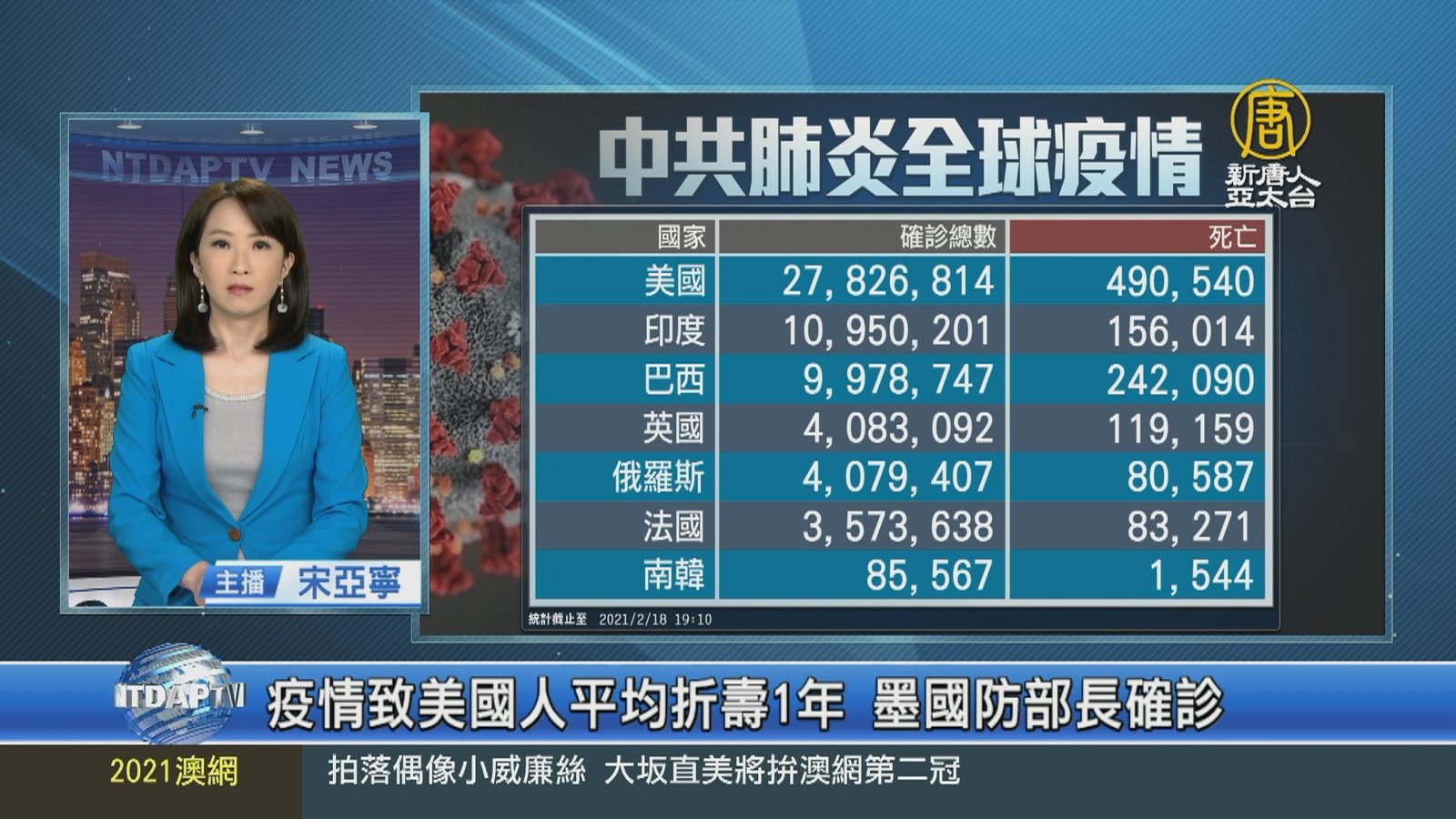 來關心中共肺炎疫情最新情況,全球確診超過1億9百94萬人,死亡2百43萬多人。但中共、伊朗等國家,被認為嚴重低報數據。疫情最嚴重的美國目前累計確診超過2千7百82萬人,死亡49萬多人。美國底特律電視台前主播哈遜山姆,在接種COVID-19疫苗隔天過世,死因仍待調查釐清。美國CDC統計顯示,受疫情衝擊,2020年上半年,美國人均預期壽命少了1歲,這也是從二戰以來的最大降幅。墨西哥國防部長桑多華宣布自己確診。印度從去年9月每天新增將近10萬例確診,下降到現在每天新增1萬例,但印度境內發現南非、巴西變種病毒株病 //asset2.ntdtv.com.tw/public/uploads/assets/2021/02/18/2021-02-18-602e5a40848e5.mp4 疫苗|變種病毒|美國|人均壽命|墨西哥國防部長|死亡|確診|南韓|中共肺炎|武漢肺炎|疫情|防疫|中共病毒|新型冠狀病毒2021-02-18 20:14:27